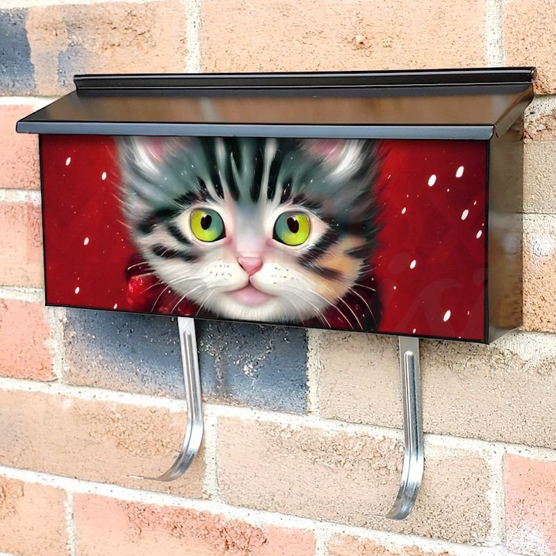 Applying your Cute Christmas Kitten townhouse / ranch mailbox cover it’s pretty easy to convert your mailbox to a special and unique item. These covers require a flat surface, so they work with townhouse / ranch mailboxes that do not have any embossed decoration or signs. Magnetic mailbox covers work with steel boxes, for aluminum and plastic boxes we offer the self-adhesive vinyl covers. In case your mailbox doesn’t work with these covers, you can purchase the preinstalled cover on a brand new mailbox as well. Also, you can create your custom townhouse / ranch mailbox cover using you own pictures, adding your name, street number, etc.