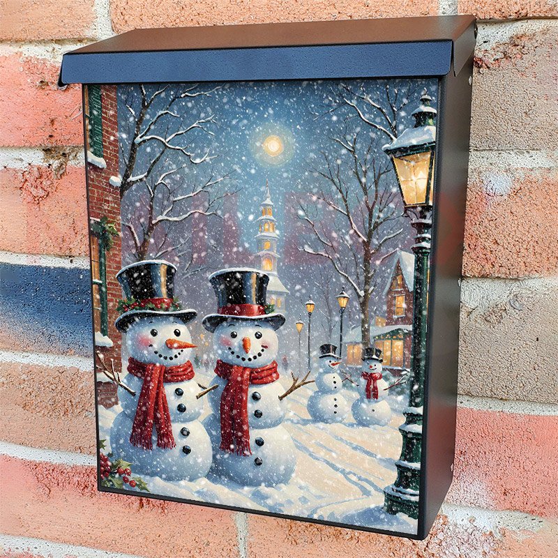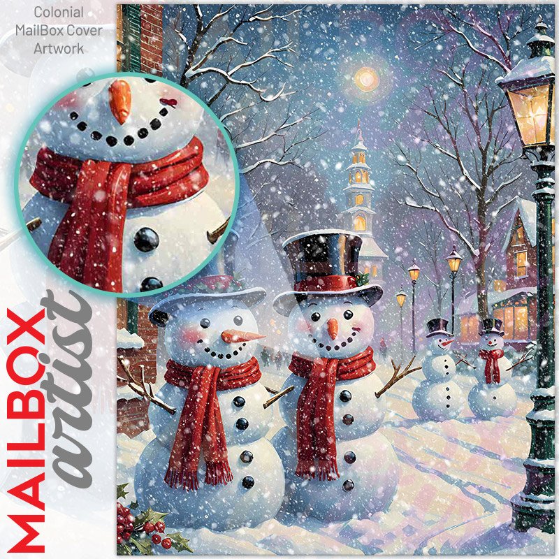 With this Cute Christmas Village with Snowmen colonial mailbox cover it’s pretty easy to convert your mailbox to a special and unique item. These covers require a flat surface, so they work with colonial mailboxes that do not have any embossed decoration or signs. Magnetic mailbox covers work with steel colonial boxes only, while self-adhesive vinyl covers are available for aluminum, plastic and steel boxes. We also offer both self-adhesive and magnetic covers with regular opaque white vinyl or reflective vinyl, which works similarly to license plates or road signs. The reflective option makes the entire cover’s surface reflective, ensuring visibility at night. In case your mailbox doesn’t work with these covers, you can purchase the preinstalled cover on a brand new mailbox as well. Also, you can create your custom colonial mailbox cover using you own pictures, adding your name, street number, etc.