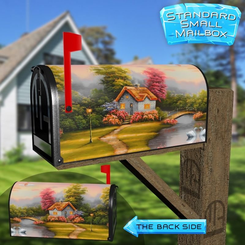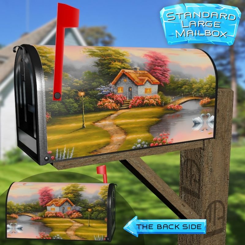Dressing up your rural farm mailbox with the Cute Cottage at the Lake #2 mailbox cover is an easy way to convert it into a unique and special item. These covers require a smooth surface, so they are compatible with rural farm mailboxes that do not have any embossed decorations or signs. Magnetic mailbox covers work with steel boxes only, while self-adhesive vinyl covers are available for aluminum, plastic and steel boxes. If your mailbox is not compatible with these covers, you can purchase a brand new mailbox with a preinstalled cover. Additionally, you have the option to create a custom rural farm mailbox cover with your own pictures, name, street number, etc.