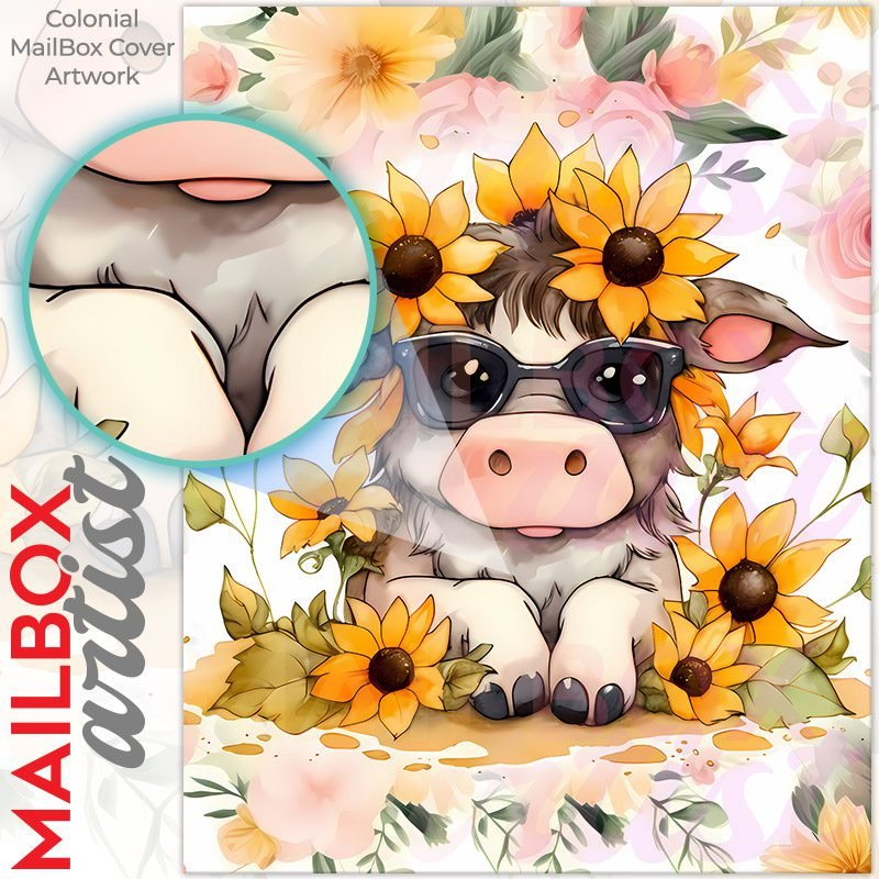 With this Cute Cow and Sunflowers colonial mailbox cover it’s pretty easy to convert your mailbox to a special and unique item. These covers require a flat surface, so they work with colonial mailboxes that do not have any embossed decoration or signs. Magnetic mailbox covers work with steel colonial boxes only, while self-adhesive vinyl covers are available for aluminum, plastic and steel boxes. We also offer both self-adhesive and magnetic covers with regular opaque white vinyl or reflective vinyl, which works similarly to license plates or road signs. The reflective option makes the entire cover’s surface reflective, ensuring visibility at night. In case your mailbox doesn’t work with these covers, you can purchase the preinstalled cover on a brand new mailbox as well. Also, you can create your custom colonial mailbox cover using you own pictures, adding your name, street number, etc.