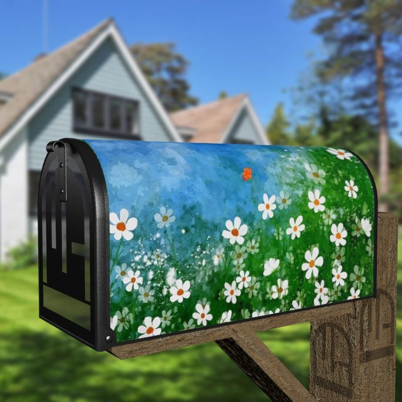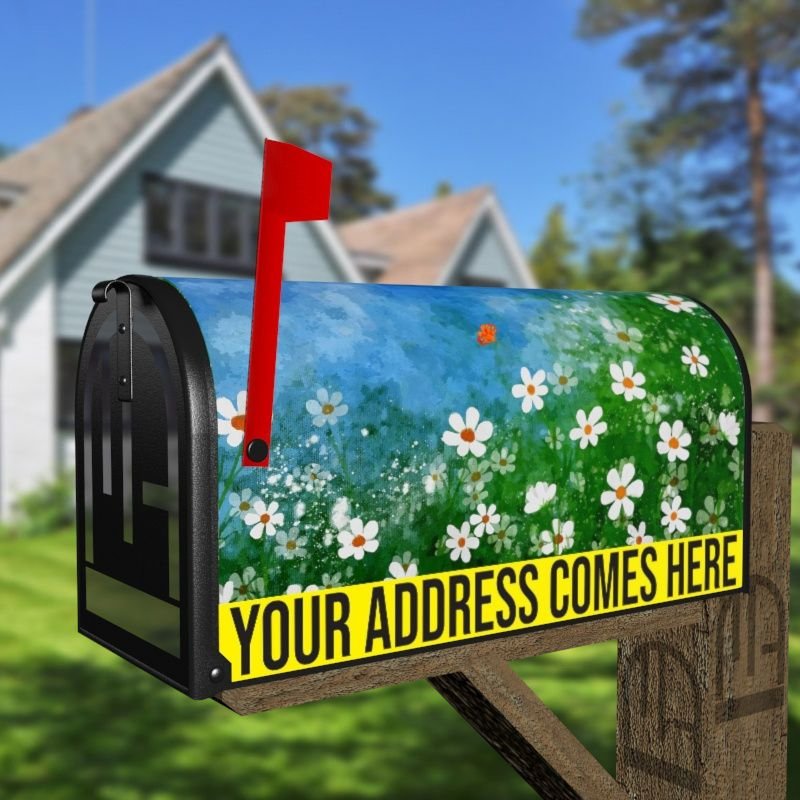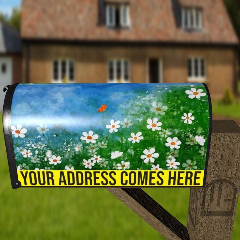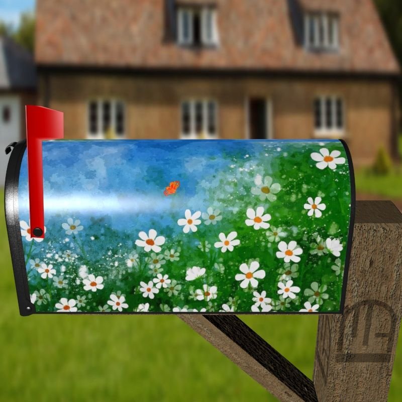 Grab this creative Cute Daisies and a butterfly rural/curbside/farm mailbox cover as self adhesive vinyl or magnetic cover. Our magnetic covers have the magnetic surface under the whole design, not only two magnet strips like in cheaper products. We also offer both the self adhesive and the magnetic covers with regular opaque white vinyl or reflective vinyl which works the same way as the licence plates or road signs; pretty visible at night. We make these covers for both large and small mailboxes.