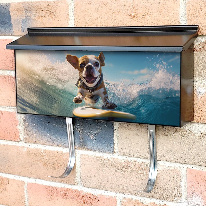 Applying your Cute Dog Surfing townhouse / ranch mailbox cover it’s pretty easy to convert your mailbox to a special and unique item. These covers require a flat surface, so they work with townhouse / ranch mailboxes that do not have any embossed decoration or signs. Magnetic mailbox covers work with steel boxes, for aluminum and plastic boxes we offer the self-adhesive vinyl covers. In case your mailbox doesn’t work with these covers, you can purchase the preinstalled cover on a brand new mailbox as well. Also, you can create your custom townhouse / ranch mailbox cover using you own pictures, adding your name, street number, etc.