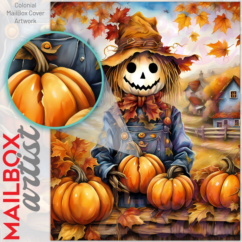 With this Cute Fall Scarecrow colonial mailbox cover it’s pretty easy to convert your mailbox to a special and unique item. These covers require a flat surface, so they work with colonial mailboxes that do not have any embossed decoration or signs. Magnetic mailbox covers work with steel colonial boxes only, while self-adhesive vinyl covers are available for aluminum, plastic and steel boxes. We also offer both self-adhesive and magnetic covers with regular opaque white vinyl or reflective vinyl, which works similarly to license plates or road signs. The reflective option makes the entire cover’s surface reflective, ensuring visibility at night. In case your mailbox doesn’t work with these covers, you can purchase the preinstalled cover on a brand new mailbox as well. Also, you can create your custom colonial mailbox cover using you own pictures, adding your name, street number, etc.