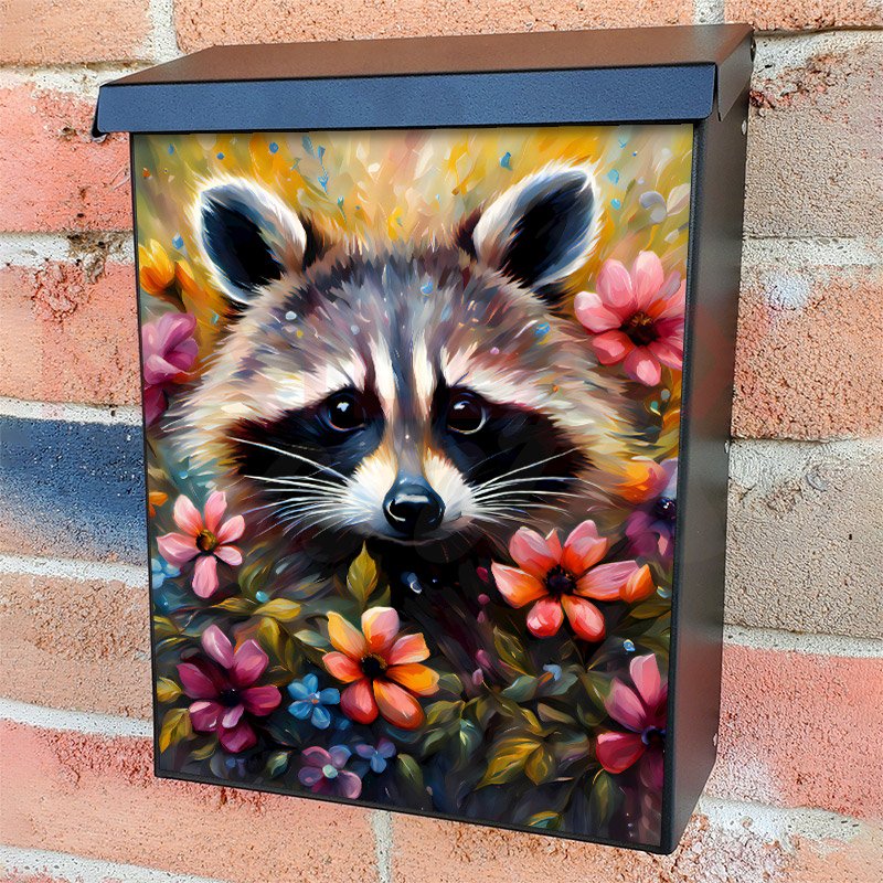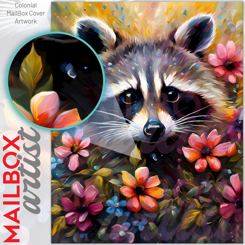 With this Cute Flower Raccoon colonial mailbox cover it’s pretty easy to convert your mailbox to a special and unique item. These covers require a flat surface, so they work with colonial mailboxes that do not have any embossed decoration or signs. Magnetic mailbox covers work with steel colonial boxes only, while self-adhesive vinyl covers are available for aluminum, plastic and steel boxes. We also offer both self-adhesive and magnetic covers with regular opaque white vinyl or reflective vinyl, which works similarly to license plates or road signs. The reflective option makes the entire cover’s surface reflective, ensuring visibility at night. In case your mailbox doesn’t work with these covers, you can purchase the preinstalled cover on a brand new mailbox as well. Also, you can create your custom colonial mailbox cover using you own pictures, adding your name, street number, etc.