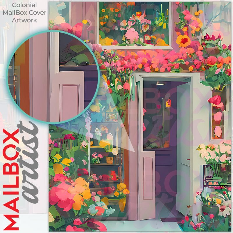With this Cute Flower Shop #1 colonial mailbox cover it’s pretty easy to convert your mailbox to a special and unique item. These covers require a flat surface, so they work with colonial mailboxes that do not have any embossed decoration or signs. Magnetic mailbox covers work with steel colonial boxes only, while self-adhesive vinyl covers are available for aluminum, plastic and steel boxes. We also offer both self-adhesive and magnetic covers with regular opaque white vinyl or reflective vinyl, which works similarly to license plates or road signs. The reflective option makes the entire cover’s surface reflective, ensuring visibility at night. In case your mailbox doesn’t work with these covers, you can purchase the preinstalled cover on a brand new mailbox as well. Also, you can create your custom colonial mailbox cover using you own pictures, adding your name, street number, etc.