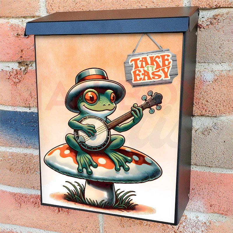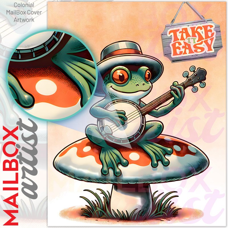 With this Cute Frog Playing Banjo colonial mailbox cover it’s pretty easy to convert your mailbox to a special and unique item. These covers require a flat surface, so they work with colonial mailboxes that do not have any embossed decoration or signs. Magnetic mailbox covers work with steel colonial boxes only, while self-adhesive vinyl covers are available for aluminum, plastic and steel boxes. We also offer both self-adhesive and magnetic covers with regular opaque white vinyl or reflective vinyl, which works similarly to license plates or road signs. The reflective option makes the entire cover’s surface reflective, ensuring visibility at night. In case your mailbox doesn’t work with these covers, you can purchase the preinstalled cover on a brand new mailbox as well. Also, you can create your custom colonial mailbox cover using you own pictures, adding your name, street number, etc.