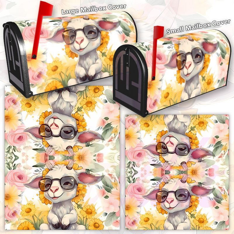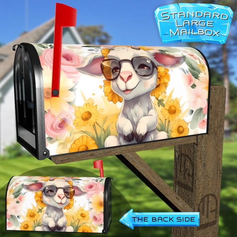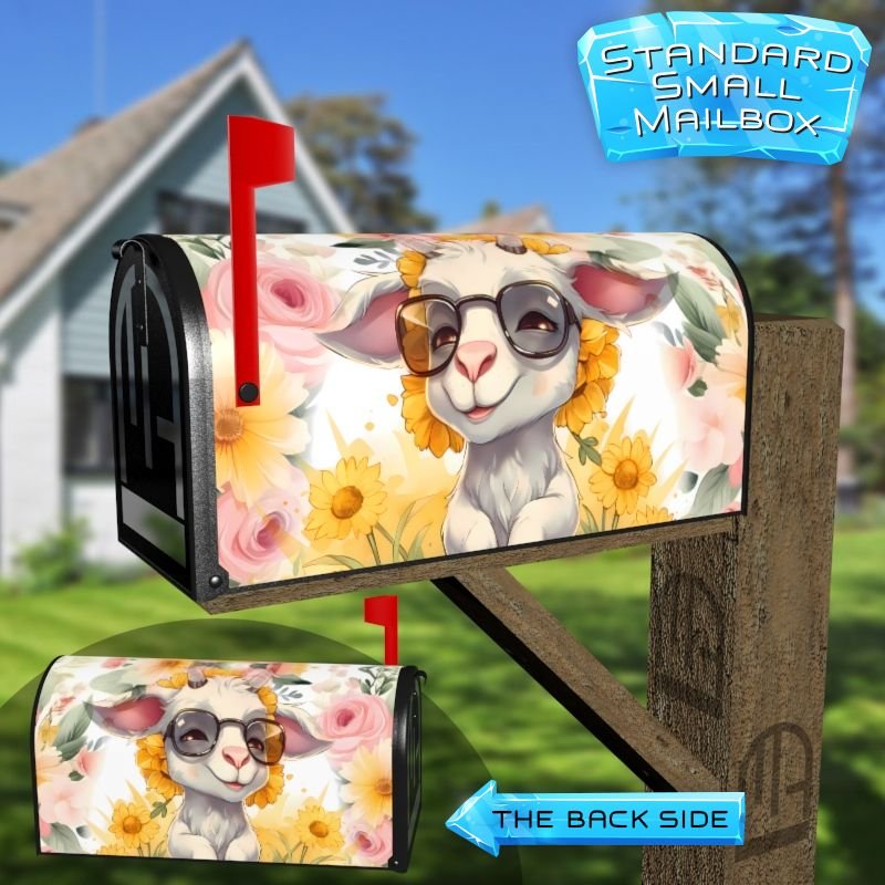 Dressing up your rural farm mailbox with the Cute Goat and Sunflowers mailbox cover is an easy way to convert it into a unique and special item. These covers require a smooth surface, so they are compatible with rural farm mailboxes that do not have any embossed decorations or signs. Magnetic mailbox covers work with steel boxes only, while self-adhesive vinyl covers are available for aluminum, plastic and steel boxes. If your mailbox is not compatible with these covers, you can purchase a brand new mailbox with a preinstalled cover. Additionally, you have the option to create a custom rural farm mailbox cover with your own pictures, name, street number, etc.