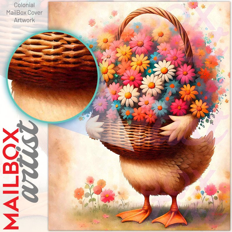 With this Cute Goose with Flowers colonial mailbox cover it’s pretty easy to convert your mailbox to a special and unique item. These covers require a flat surface, so they work with colonial mailboxes that do not have any embossed decoration or signs. Magnetic mailbox covers work with steel colonial boxes only, while self-adhesive vinyl covers are available for aluminum, plastic and steel boxes. We also offer both self-adhesive and magnetic covers with regular opaque white vinyl or reflective vinyl, which works similarly to license plates or road signs. The reflective option makes the entire cover’s surface reflective, ensuring visibility at night. In case your mailbox doesn’t work with these covers, you can purchase the preinstalled cover on a brand new mailbox as well. Also, you can create your custom colonial mailbox cover using you own pictures, adding your name, street number, etc.