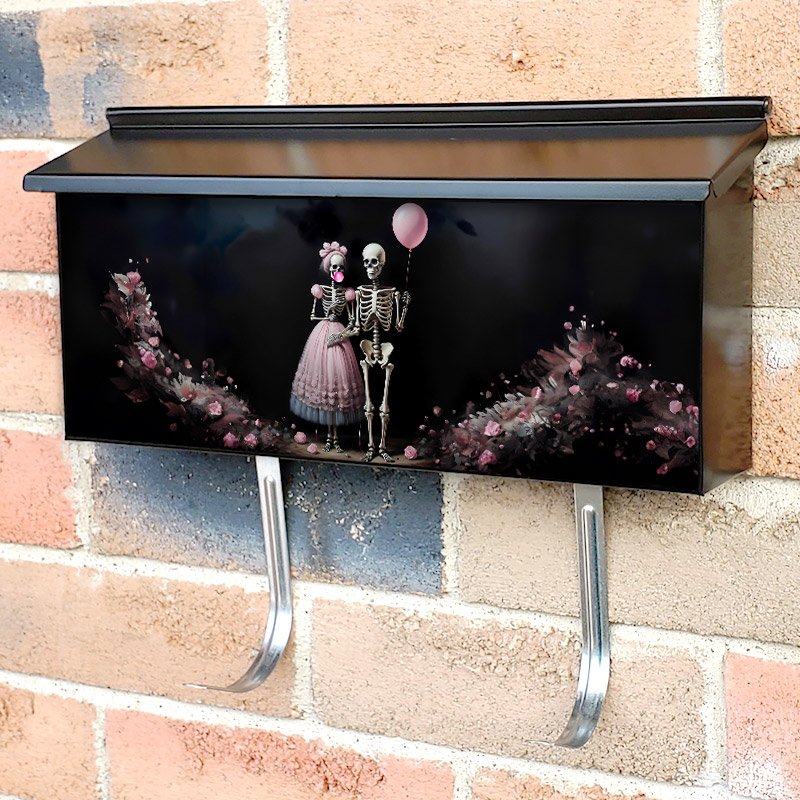 Applying your Cute Halloween Skeleton Couple townhouse / ranch mailbox cover it’s pretty easy to convert your mailbox to a special and unique item. These covers require a flat surface, so they work with townhouse / ranch mailboxes that do not have any embossed decoration or signs. Magnetic mailbox covers work with steel boxes, for aluminum and plastic boxes we offer the self-adhesive vinyl covers. In case your mailbox doesn’t work with these covers, you can purchase the preinstalled cover on a brand new mailbox as well. Also, you can create your custom townhouse / ranch mailbox cover using you own pictures, adding your name, street number, etc.