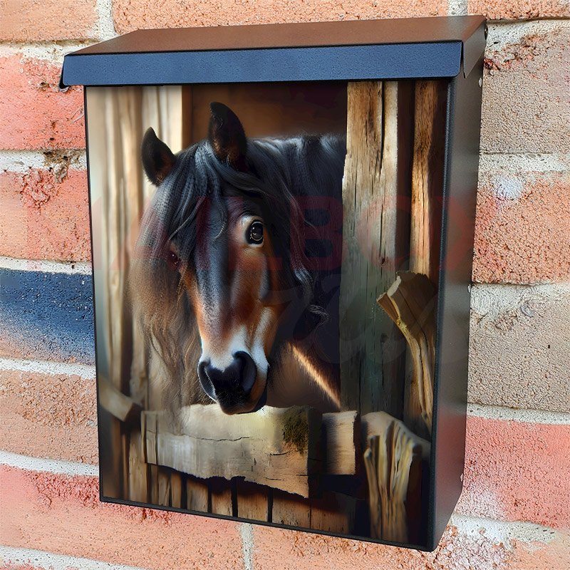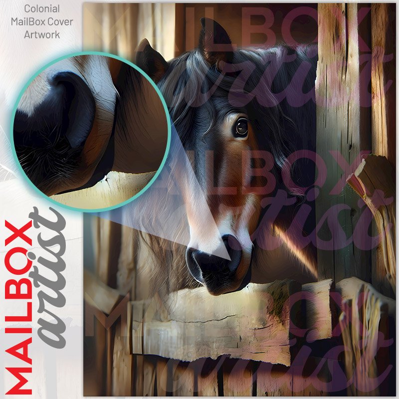 With this Cute Horse in the Stable colonial mailbox cover it’s pretty easy to convert your mailbox to a special and unique item. These covers require a flat surface, so they work with colonial mailboxes that do not have any embossed decoration or signs. Magnetic mailbox covers work with steel colonial boxes only, while self-adhesive vinyl covers are available for aluminum, plastic and steel boxes. We also offer both self-adhesive and magnetic covers with regular opaque white vinyl or reflective vinyl, which works similarly to license plates or road signs. The reflective option makes the entire cover’s surface reflective, ensuring visibility at night. In case your mailbox doesn’t work with these covers, you can purchase the preinstalled cover on a brand new mailbox as well. Also, you can create your custom colonial mailbox cover using you own pictures, adding your name, street number, etc.