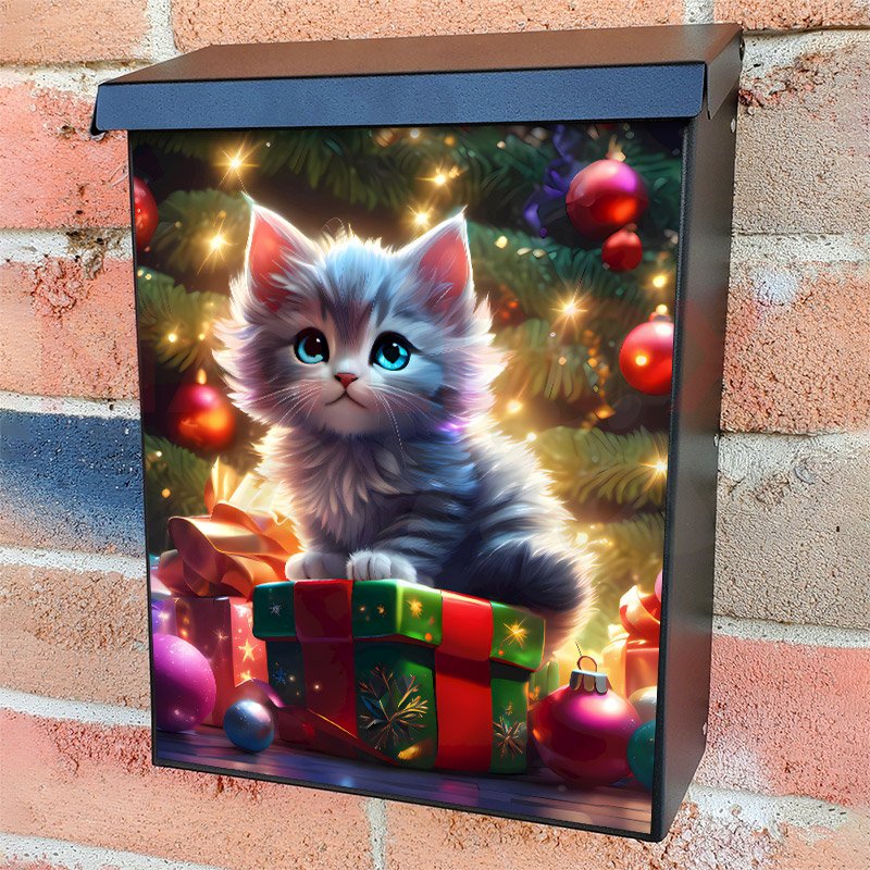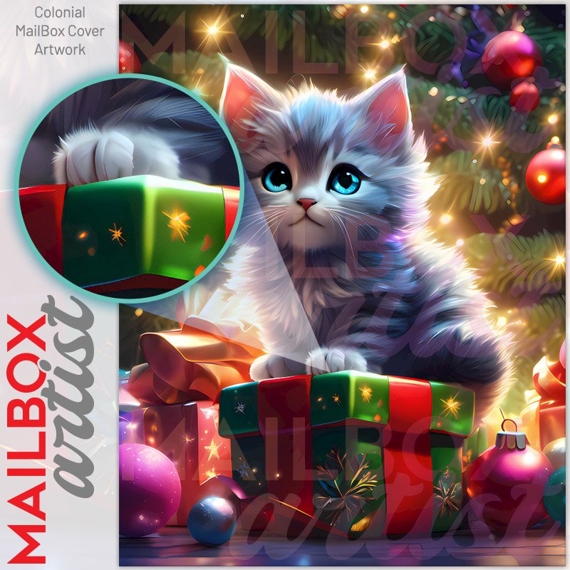 With this Cute Kitten Under the Christmas Tree colonial mailbox cover it’s pretty easy to convert your mailbox to a special and unique item. These covers require a flat surface, so they work with colonial mailboxes that do not have any embossed decoration or signs. Magnetic mailbox covers work with steel colonial boxes only, while self-adhesive vinyl covers are available for aluminum, plastic and steel boxes. We also offer both self-adhesive and magnetic covers with regular opaque white vinyl or reflective vinyl, which works similarly to license plates or road signs. The reflective option makes the entire cover’s surface reflective, ensuring visibility at night. In case your mailbox doesn’t work with these covers, you can purchase the preinstalled cover on a brand new mailbox as well. Also, you can create your custom colonial mailbox cover using you own pictures, adding your name, street number, etc.