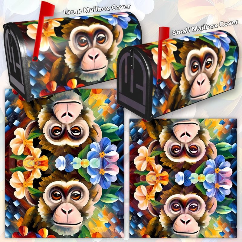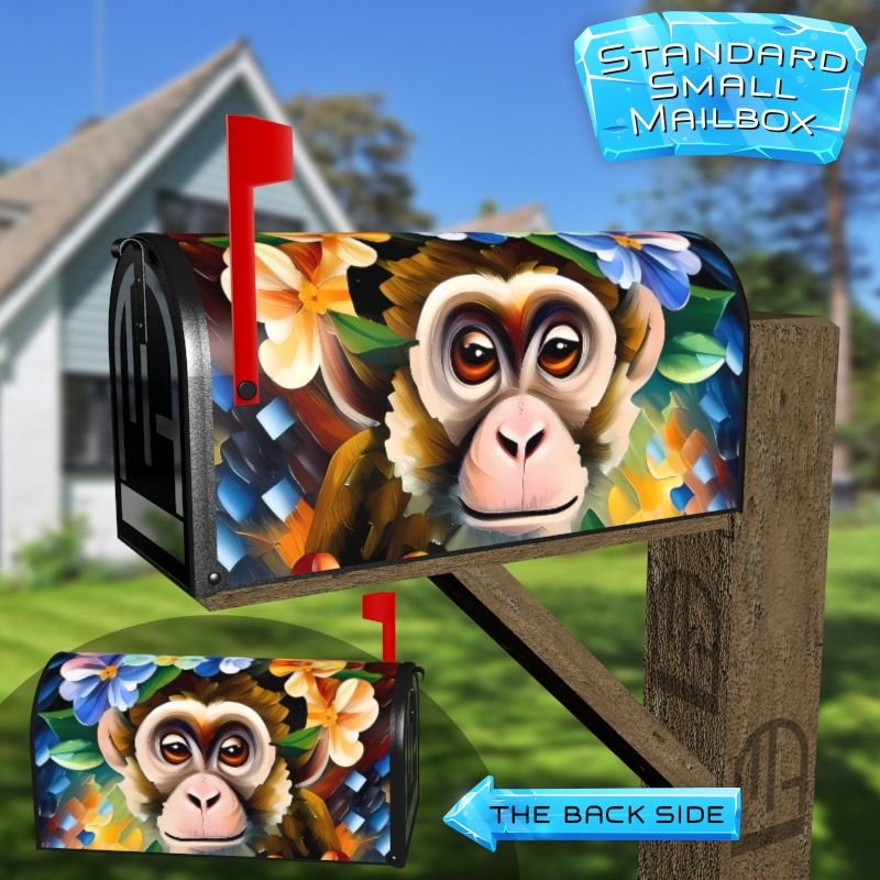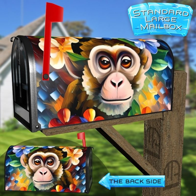 Dressing up your rural farm mailbox with the Cute Monkey with Flowers mailbox cover is an easy way to convert it into a unique and special item. These covers require a smooth surface, so they are compatible with rural farm mailboxes that do not have any embossed decorations or signs. Magnetic mailbox covers work with steel boxes only, while self-adhesive vinyl covers are available for aluminum, plastic and steel boxes. If your mailbox is not compatible with these covers, you can purchase a brand new mailbox with a preinstalled cover. Additionally, you have the option to create a custom rural farm mailbox cover with your own pictures, name, street number, etc.