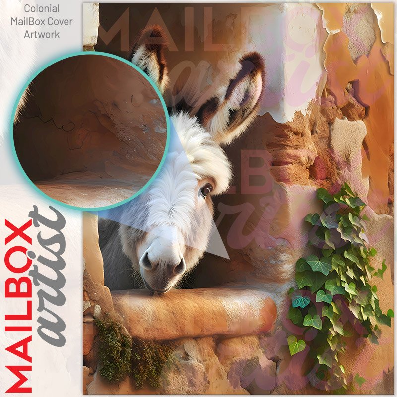 With this Cute Peeking Donkey colonial mailbox cover it’s pretty easy to convert your mailbox to a special and unique item. These covers require a flat surface, so they work with colonial mailboxes that do not have any embossed decoration or signs. Magnetic mailbox covers work with steel colonial boxes only, while self-adhesive vinyl covers are available for aluminum, plastic and steel boxes. We also offer both self-adhesive and magnetic covers with regular opaque white vinyl or reflective vinyl, which works similarly to license plates or road signs. The reflective option makes the entire cover’s surface reflective, ensuring visibility at night. In case your mailbox doesn’t work with these covers, you can purchase the preinstalled cover on a brand new mailbox as well. Also, you can create your custom colonial mailbox cover using you own pictures, adding your name, street number, etc.