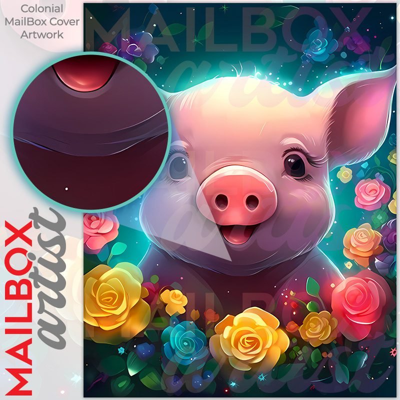 With this Cute Piglet with Flowers colonial mailbox cover it’s pretty easy to convert your mailbox to a special and unique item. These covers require a flat surface, so they work with colonial mailboxes that do not have any embossed decoration or signs. Magnetic mailbox covers work with steel colonial boxes only, while self-adhesive vinyl covers are available for aluminum, plastic and steel boxes. We also offer both self-adhesive and magnetic covers with regular opaque white vinyl or reflective vinyl, which works similarly to license plates or road signs. The reflective option makes the entire cover’s surface reflective, ensuring visibility at night. In case your mailbox doesn’t work with these covers, you can purchase the preinstalled cover on a brand new mailbox as well. Also, you can create your custom colonial mailbox cover using you own pictures, adding your name, street number, etc.