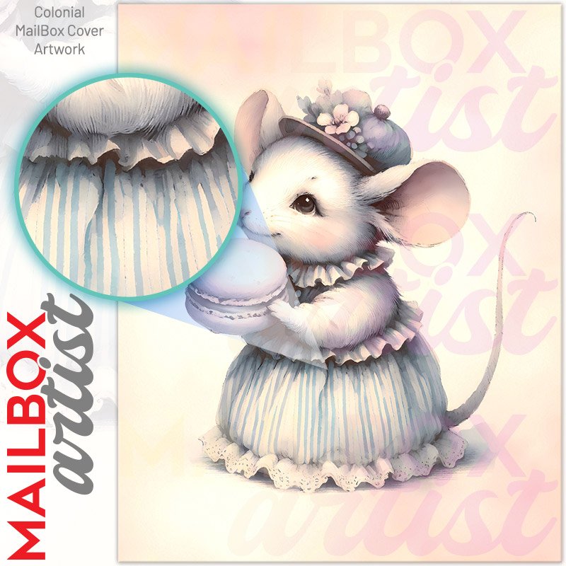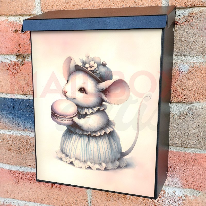 With this Cute Victorian Mouse with a Macaroon colonial mailbox cover it’s pretty easy to convert your mailbox to a special and unique item. These covers require a flat surface, so they work with colonial mailboxes that do not have any embossed decoration or signs. Magnetic mailbox covers work with steel colonial boxes only, while self-adhesive vinyl covers are available for aluminum, plastic and steel boxes. We also offer both self-adhesive and magnetic covers with regular opaque white vinyl or reflective vinyl, which works similarly to license plates or road signs. The reflective option makes the entire cover’s surface reflective, ensuring visibility at night. In case your mailbox doesn’t work with these covers, you can purchase the preinstalled cover on a brand new mailbox as well. Also, you can create your custom colonial mailbox cover using you own pictures, adding your name, street number, etc.
