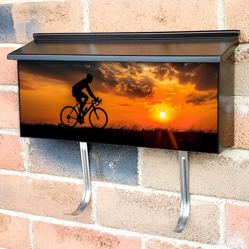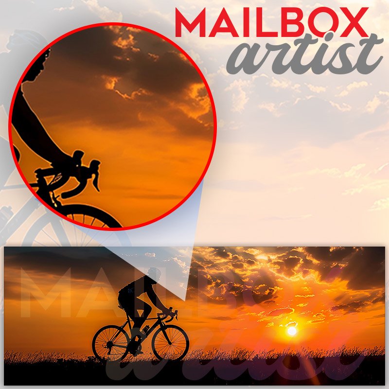 Applying your Cyclist At Sunset townhouse / ranch mailbox cover it’s pretty easy to convert your mailbox to a special and unique item. These covers require a flat surface, so they work with townhouse / ranch mailboxes that do not have any embossed decoration or signs. Magnetic mailbox covers work with steel boxes, for aluminum and plastic boxes we offer the self-adhesive vinyl covers. In case your mailbox doesn’t work with these covers, you can purchase the preinstalled cover on a brand new mailbox as well. Also, you can create your custom townhouse / ranch mailbox cover using you own pictures, adding your name, street number, etc.