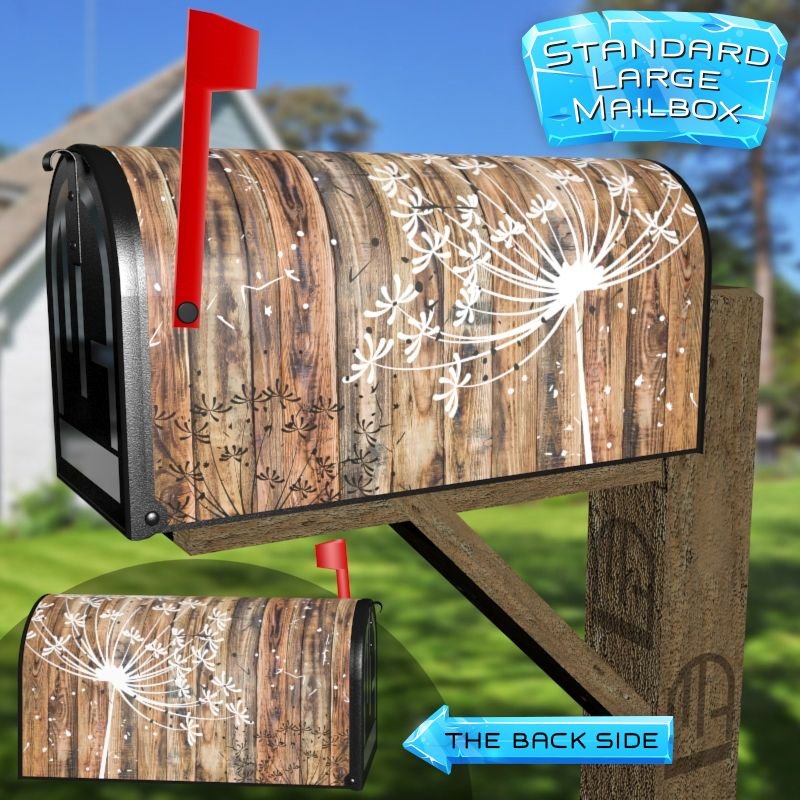 Dressing up your rural farm mailbox with the Dandelions on Wood Design mailbox cover is an easy way to convert it into a unique and special item. These covers require a smooth surface, so they are compatible with rural farm mailboxes that do not have any embossed decorations or signs. Magnetic mailbox covers work with steel boxes only, while self-adhesive vinyl covers are available for aluminum, plastic and steel boxes. If your mailbox is not compatible with these covers, you can purchase a brand new mailbox with a preinstalled cover. Additionally, you have the option to create a custom rural farm mailbox cover with your own pictures, name, street number, etc.