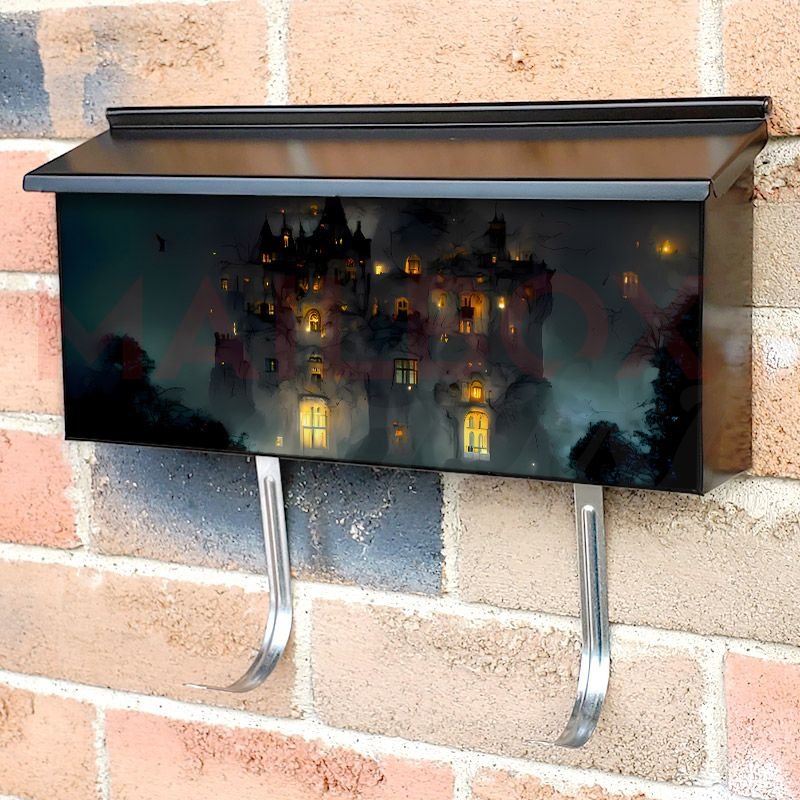 Applying your Dark Halloween Castle townhouse / ranch mailbox cover it’s pretty easy to convert your mailbox to a special and unique item. These covers require a flat surface, so they work with townhouse / ranch mailboxes that do not have any embossed decoration or signs. Magnetic mailbox covers work with steel boxes, for aluminum and plastic boxes we offer the self-adhesive vinyl covers. In case your mailbox doesn’t work with these covers, you can purchase the preinstalled cover on a brand new mailbox as well. Also, you can create your custom townhouse / ranch mailbox cover using you own pictures, adding your name, street number, etc.