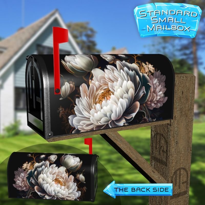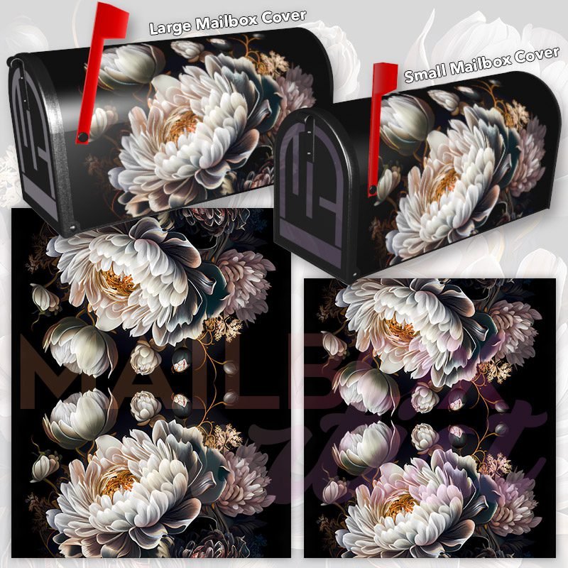 Dressing up your rural farm mailbox with the Delicate White Peonies #2 mailbox cover is an easy way to convert it into a unique and special item. These covers require a smooth surface, so they are compatible with rural farm mailboxes that do not have any embossed decorations or signs. Magnetic mailbox covers work with steel boxes only, while self-adhesive vinyl covers are available for aluminum, plastic and steel boxes. If your mailbox is not compatible with these covers, you can purchase a brand new mailbox with a preinstalled cover. Additionally, you have the option to create a custom rural farm mailbox cover with your own pictures, name, street number, etc.