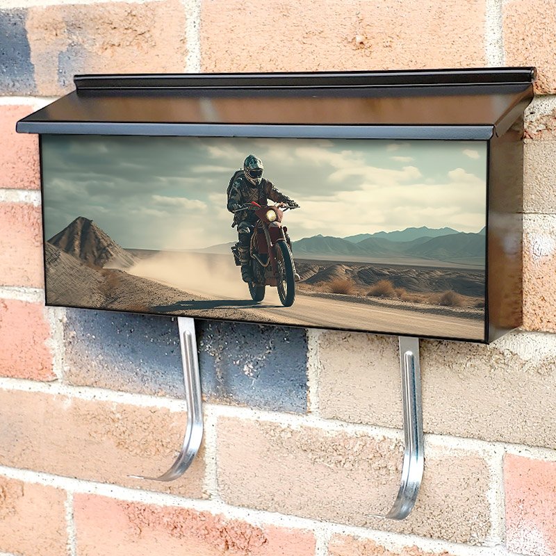 Applying your Desert Sand Road Mountain Bike 2 townhouse / ranch mailbox cover it’s pretty easy to convert your mailbox to a special and unique item. These covers require a flat surface, so they work with townhouse / ranch mailboxes that do not have any embossed decoration or signs. Magnetic mailbox covers work with steel boxes, for aluminum and plastic boxes we offer the self-adhesive vinyl covers. In case your mailbox doesn’t work with these covers, you can purchase the preinstalled cover on a brand new mailbox as well. Also, you can create your custom townhouse / ranch mailbox cover using you own pictures, adding your name, street number, etc.