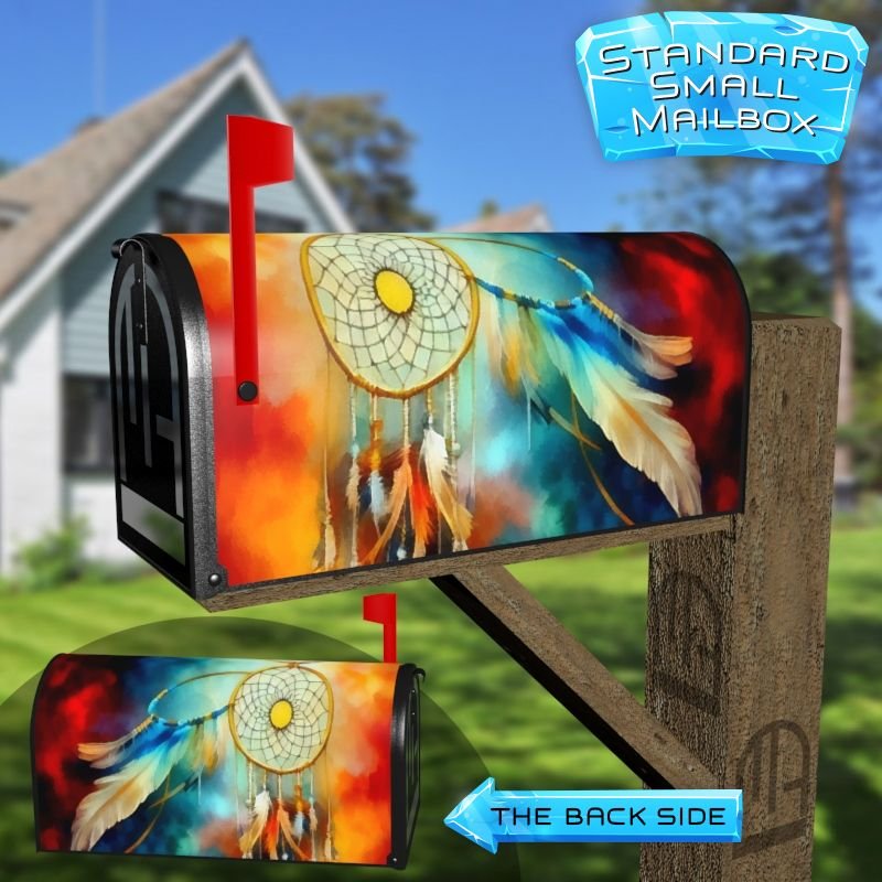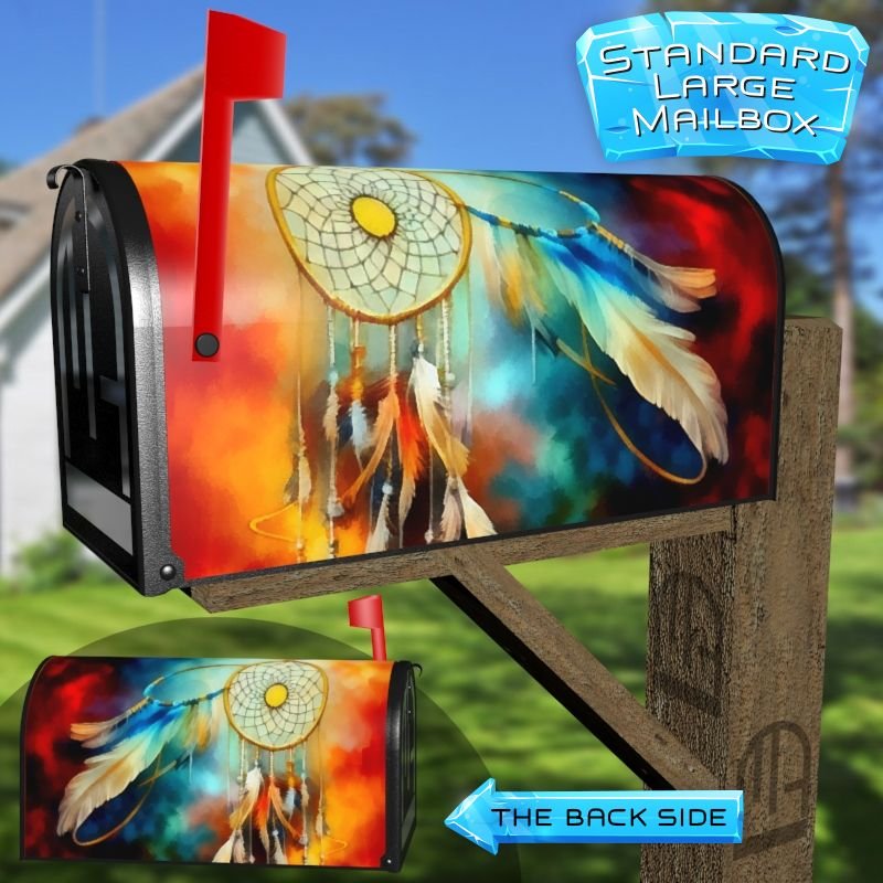 Dressing up your rural farm mailbox with the Dreamcatcher in the Wind mailbox cover is an easy way to convert it into a unique and special item. These covers require a smooth surface, so they are compatible with rural farm mailboxes that do not have any embossed decorations or signs. Magnetic mailbox covers work with steel boxes only, while self-adhesive vinyl covers are available for aluminum, plastic and steel boxes. If your mailbox is not compatible with these covers, you can purchase a brand new mailbox with a preinstalled cover. Additionally, you have the option to create a custom rural farm mailbox cover with your own pictures, name, street number, etc.