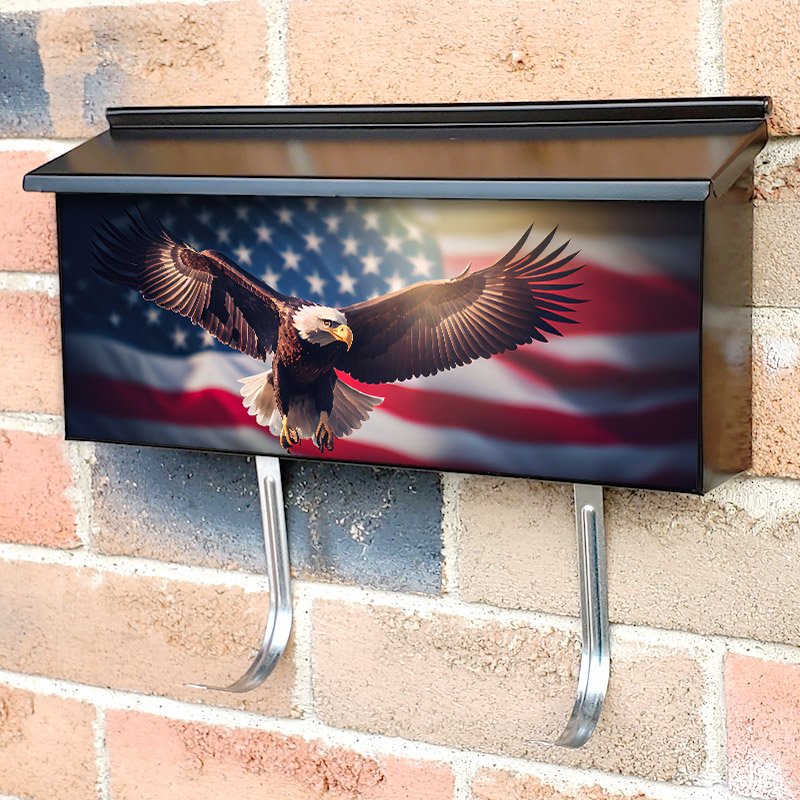Applying your Eagle With American Flag Flies In The Sky townhouse / ranch mailbox cover it’s pretty easy to convert your mailbox to a special and unique item. These covers require a flat surface, so they work with townhouse / ranch mailboxes that do not have any embossed decoration or signs. Magnetic mailbox covers work with steel boxes, for aluminum and plastic boxes we offer the self-adhesive vinyl covers. In case your mailbox doesn’t work with these covers, you can purchase the preinstalled cover on a brand new mailbox as well. Also, you can create your custom townhouse / ranch mailbox cover using you own pictures, adding your name, street number, etc.