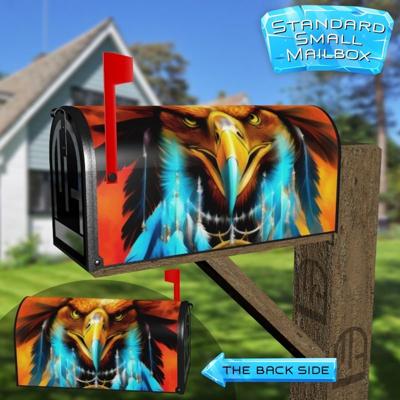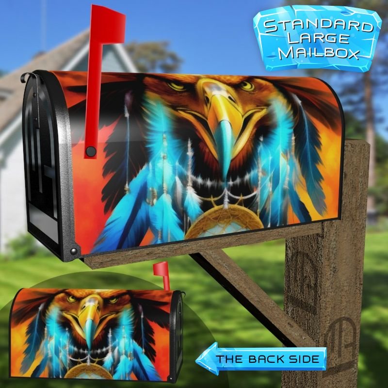 Dressing up your rural farm mailbox with the Eagle with Dreamcatcher #16 mailbox cover is an easy way to convert it into a unique and special item. These covers require a smooth surface, so they are compatible with rural farm mailboxes that do not have any embossed decorations or signs. Magnetic mailbox covers work with steel boxes only, while self-adhesive vinyl covers are available for aluminum, plastic and steel boxes. If your mailbox is not compatible with these covers, you can purchase a brand new mailbox with a preinstalled cover. Additionally, you have the option to create a custom rural farm mailbox cover with your own pictures, name, street number, etc.