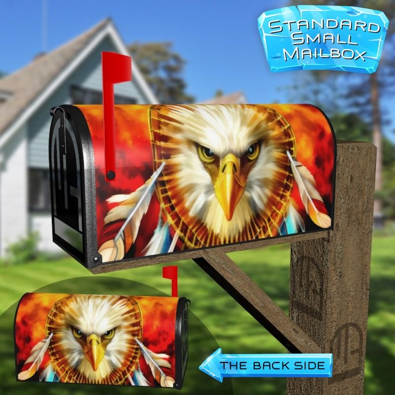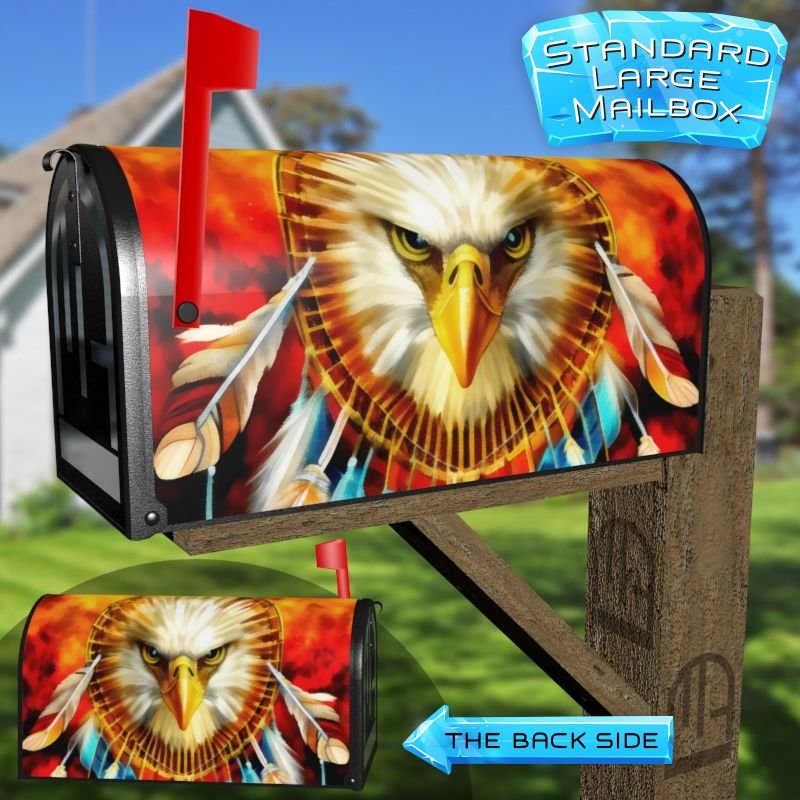 Dressing up your rural farm mailbox with the Eagle with Dreamcatcher #7 mailbox cover is an easy way to convert it into a unique and special item. These covers require a smooth surface, so they are compatible with rural farm mailboxes that do not have any embossed decorations or signs. Magnetic mailbox covers work with steel boxes only, while self-adhesive vinyl covers are available for aluminum, plastic and steel boxes. If your mailbox is not compatible with these covers, you can purchase a brand new mailbox with a preinstalled cover. Additionally, you have the option to create a custom rural farm mailbox cover with your own pictures, name, street number, etc.