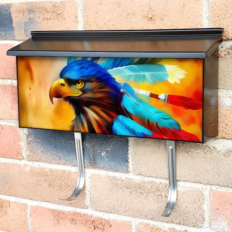 Applying your Eagle with Feathers #2 townhouse / ranch mailbox cover it’s pretty easy to convert your mailbox to a special and unique item. These covers require a flat surface, so they work with townhouse / ranch mailboxes that do not have any embossed decoration or signs. Magnetic mailbox covers work with steel boxes, for aluminum and plastic boxes we offer the self-adhesive vinyl covers. In case your mailbox doesn’t work with these covers, you can purchase the preinstalled cover on a brand new mailbox as well. Also, you can create your custom townhouse / ranch mailbox cover using you own pictures, adding your name, street number, etc.