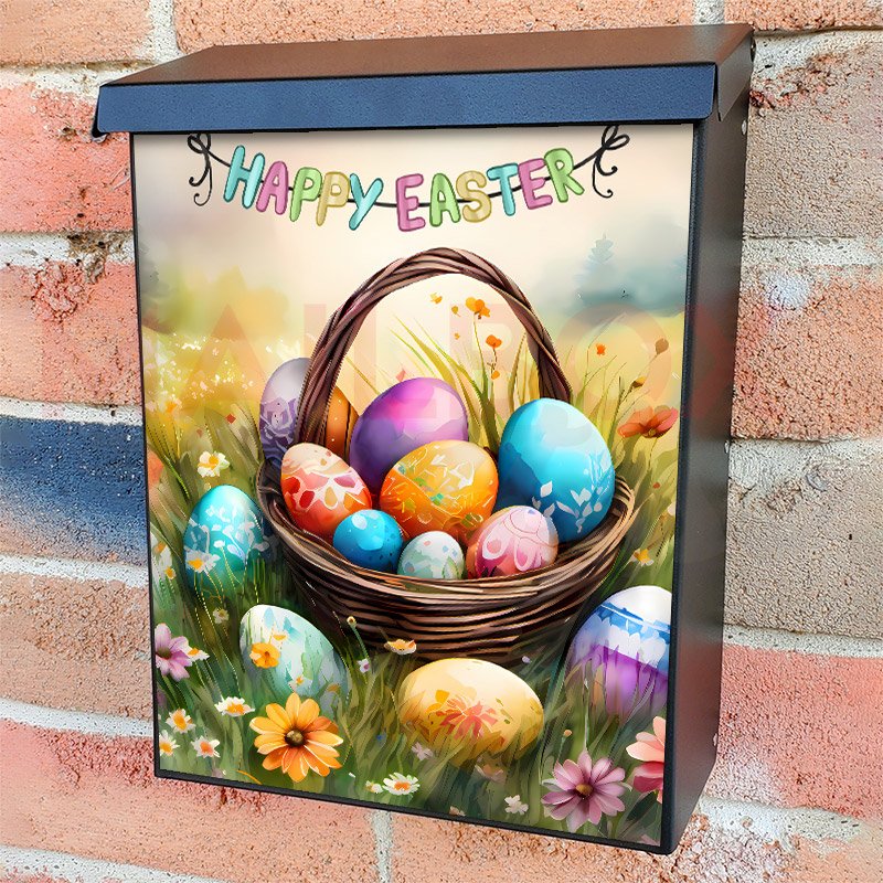 With this Easter Basket with Eggs colonial mailbox cover it’s pretty easy to convert your mailbox to a special and unique item. These covers require a flat surface, so they work with colonial mailboxes that do not have any embossed decoration or signs. Magnetic mailbox covers work with steel colonial boxes only, while self-adhesive vinyl covers are available for aluminum, plastic and steel boxes. We also offer both self-adhesive and magnetic covers with regular opaque white vinyl or reflective vinyl, which works similarly to license plates or road signs. The reflective option makes the entire cover’s surface reflective, ensuring visibility at night. In case your mailbox doesn’t work with these covers, you can purchase the preinstalled cover on a brand new mailbox as well. Also, you can create your custom colonial mailbox cover using you own pictures, adding your name, street number, etc.