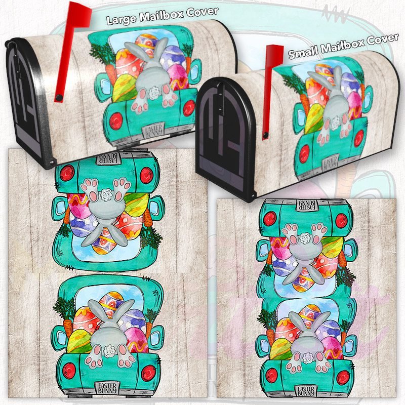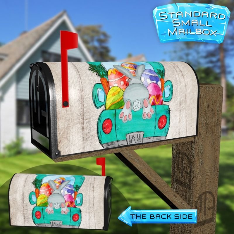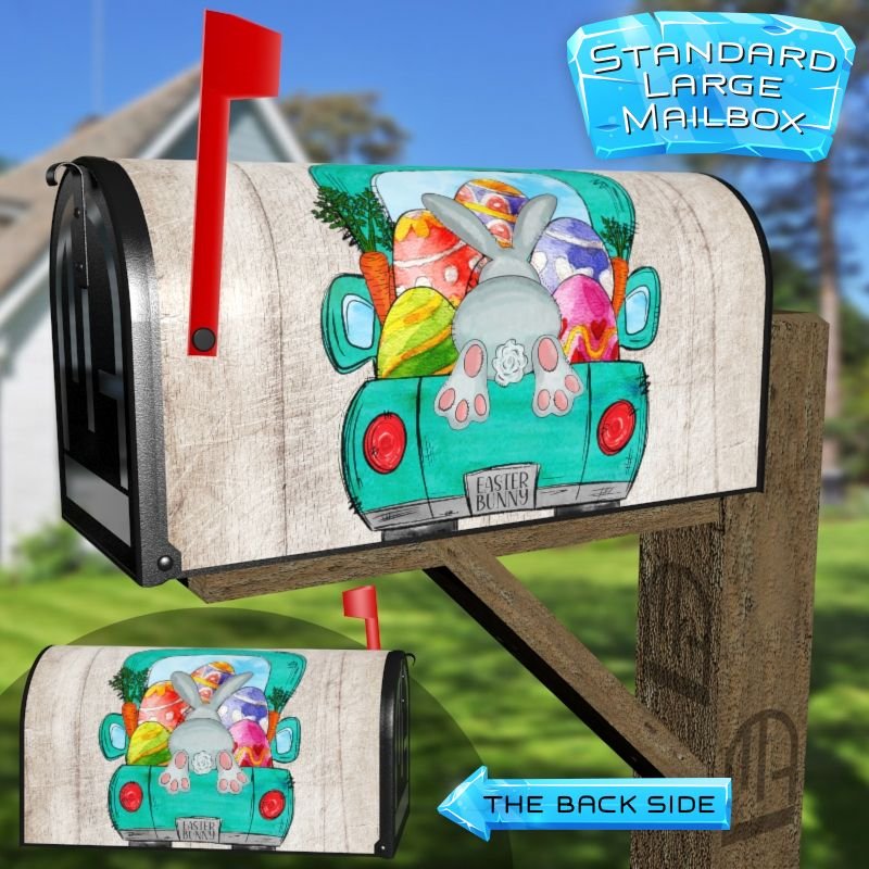 Dressing up your rural farm mailbox with the Easter Bunny on a Truck mailbox cover is an easy way to convert it into a unique and special item. These covers require a smooth surface, so they are compatible with rural farm mailboxes that do not have any embossed decorations or signs. Magnetic mailbox covers work with steel boxes only, while self-adhesive vinyl covers are available for aluminum, plastic and steel boxes. If your mailbox is not compatible with these covers, you can purchase a brand new mailbox with a preinstalled cover. Additionally, you have the option to create a custom rural farm mailbox cover with your own pictures, name, street number, etc.