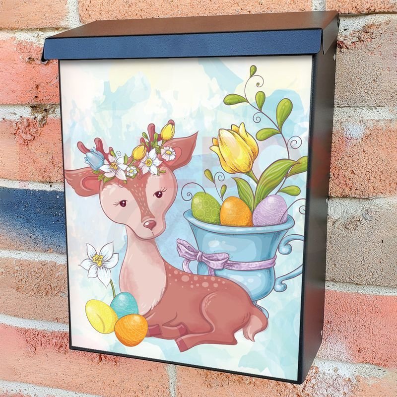 With this Easter Doe with Eggs and Flowers colonial mailbox cover it’s pretty easy to convert your mailbox to a special and unique item. These covers require a flat surface, so they work with colonial mailboxes that do not have any embossed decoration or signs. In case your mailbox doesn’t work with these covers, you can purchase the preinstalled cover on a brand new mailbox as well. Also, you can create your custom colonial mailbox cover using you own pictures, adding your name, street number, etc.