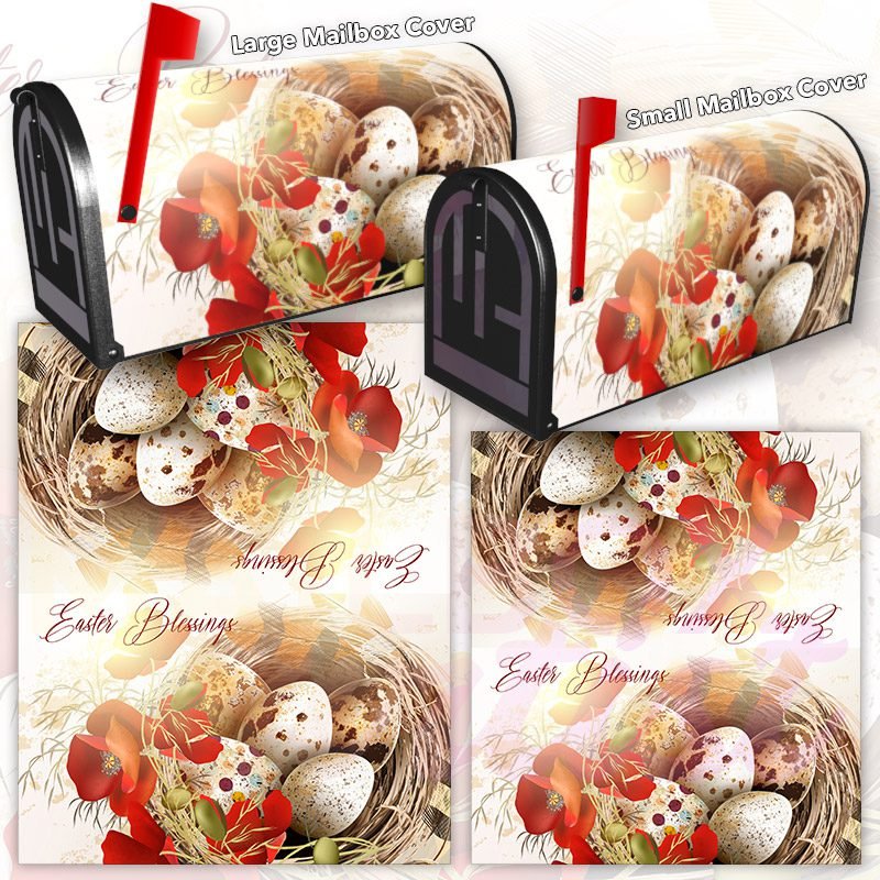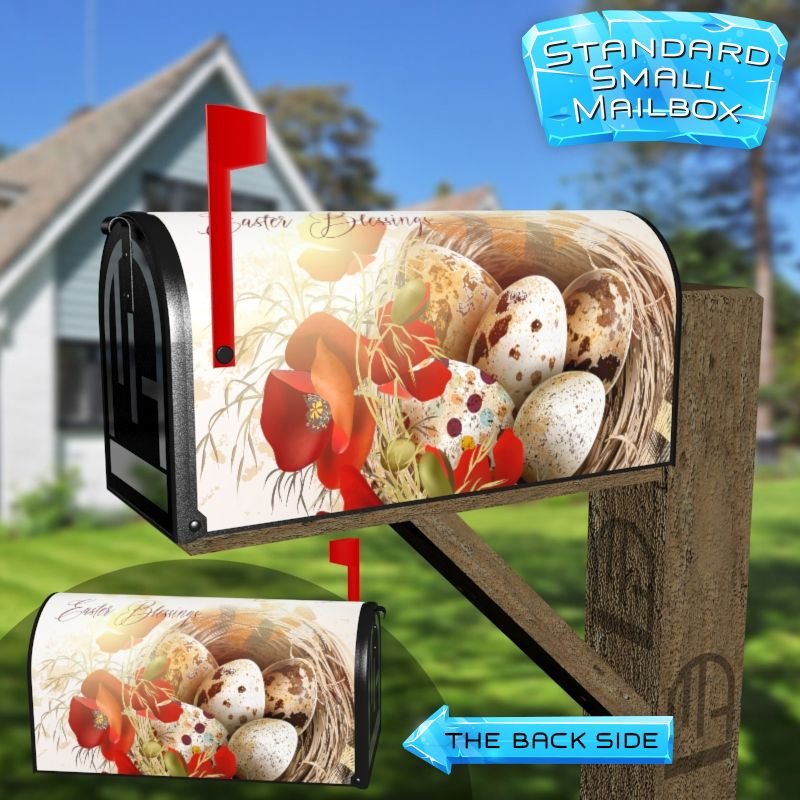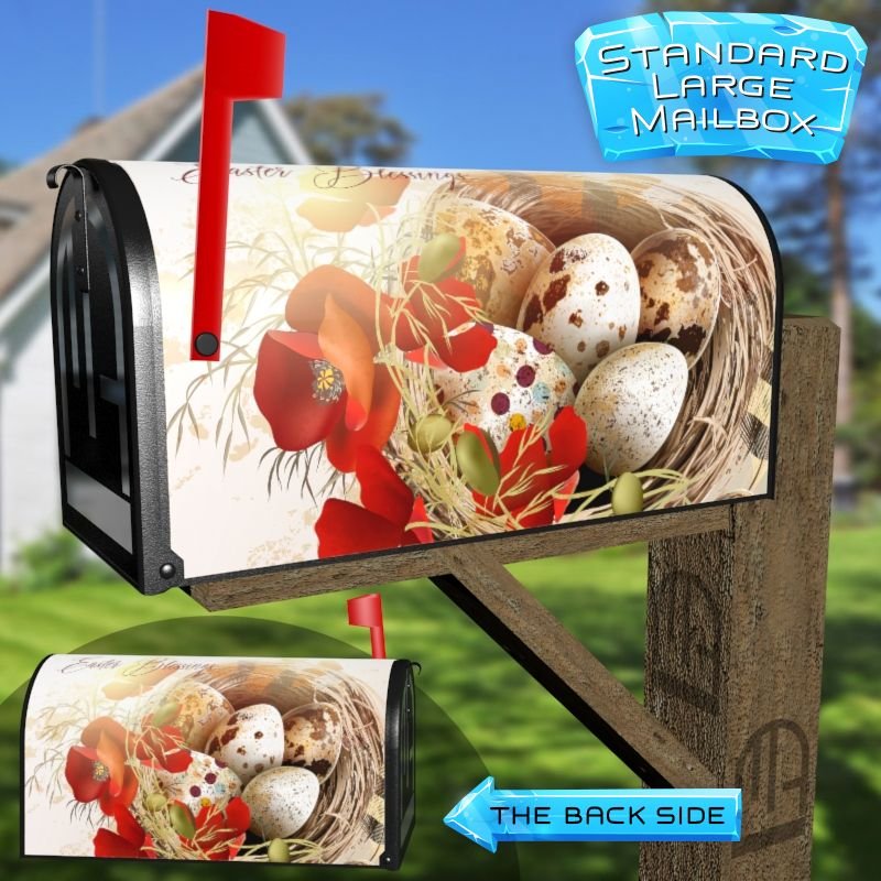 Dressing up your rural farm mailbox with the Easter Nest with Poppies mailbox cover is an easy way to convert it into a unique and special item. These covers require a smooth surface, so they are compatible with rural farm mailboxes that do not have any embossed decorations or signs. Magnetic mailbox covers work with steel boxes only, while self-adhesive vinyl covers are available for aluminum, plastic and steel boxes. If your mailbox is not compatible with these covers, you can purchase a brand new mailbox with a preinstalled cover. Additionally, you have the option to create a custom rural farm mailbox cover with your own pictures, name, street number, etc.
