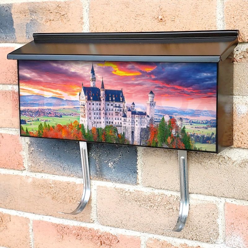 Applying your Fairytale Neuschwanstein Castle townhouse / ranch mailbox cover it’s pretty easy to convert your mailbox to a special and unique item. These covers require a flat surface, so they work with townhouse / ranch mailboxes that do not have any embossed decoration or signs. Magnetic mailbox covers work with steel boxes, for aluminum and plastic boxes we offer the self-adhesive vinyl covers. In case your mailbox doesn’t work with these covers, you can purchase the preinstalled cover on a brand new mailbox as well. Also, you can create your custom townhouse / ranch mailbox cover using you own pictures, adding your name, street number, etc.
