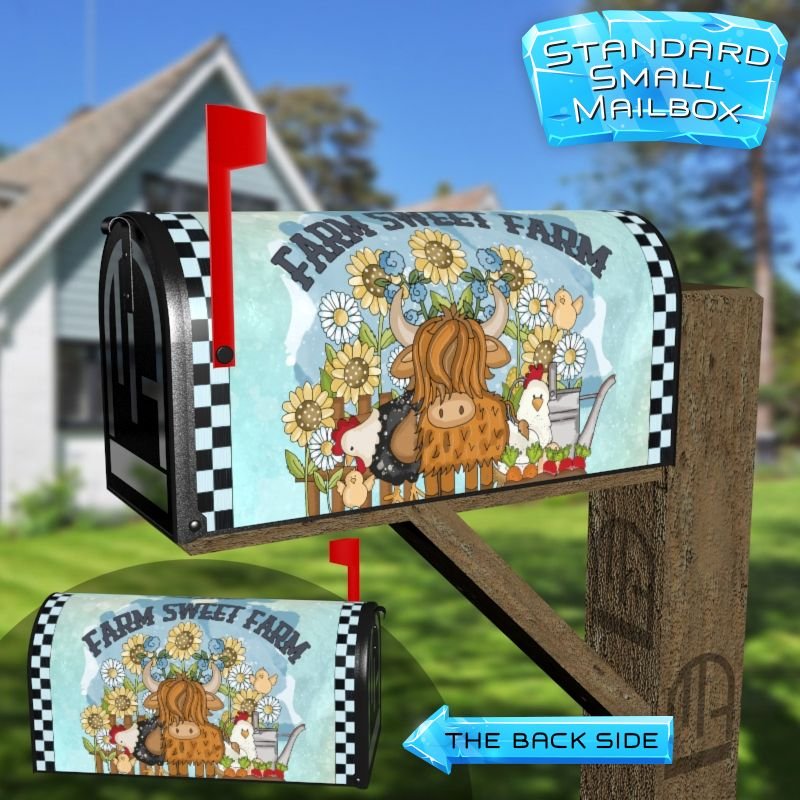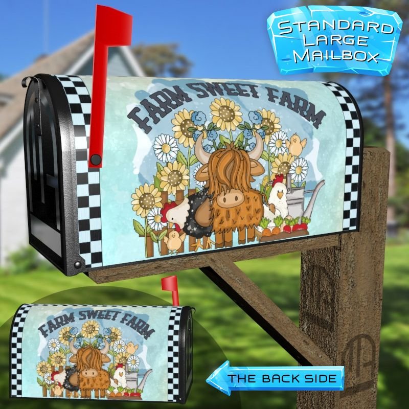 Dressing up your rural farm mailbox with the Farm Sweet Farm mailbox cover is an easy way to convert it into a unique and special item. These covers require a smooth surface, so they are compatible with rural farm mailboxes that do not have any embossed decorations or signs. Magnetic mailbox covers work with steel boxes only, while self-adhesive vinyl covers are available for aluminum, plastic and steel boxes. If your mailbox is not compatible with these covers, you can purchase a brand new mailbox with a preinstalled cover. Additionally, you have the option to create a custom rural farm mailbox cover with your own pictures, name, street number, etc.