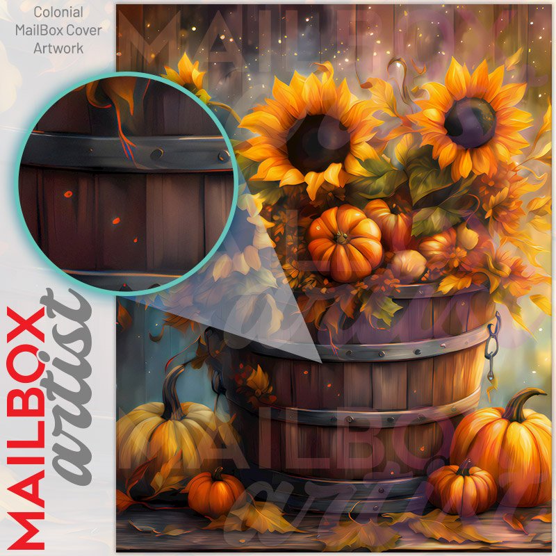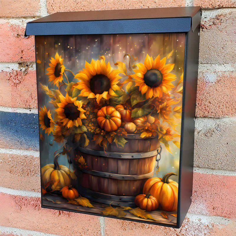 With this Farmhouse Bucket with Sunflowers colonial mailbox cover it’s pretty easy to convert your mailbox to a special and unique item. These covers require a flat surface, so they work with colonial mailboxes that do not have any embossed decoration or signs. Magnetic mailbox covers work with steel colonial boxes only, while self-adhesive vinyl covers are available for aluminum, plastic and steel boxes. We also offer both self-adhesive and magnetic covers with regular opaque white vinyl or reflective vinyl, which works similarly to license plates or road signs. The reflective option makes the entire cover’s surface reflective, ensuring visibility at night. In case your mailbox doesn’t work with these covers, you can purchase the preinstalled cover on a brand new mailbox as well. Also, you can create your custom colonial mailbox cover using you own pictures, adding your name, street number, etc.