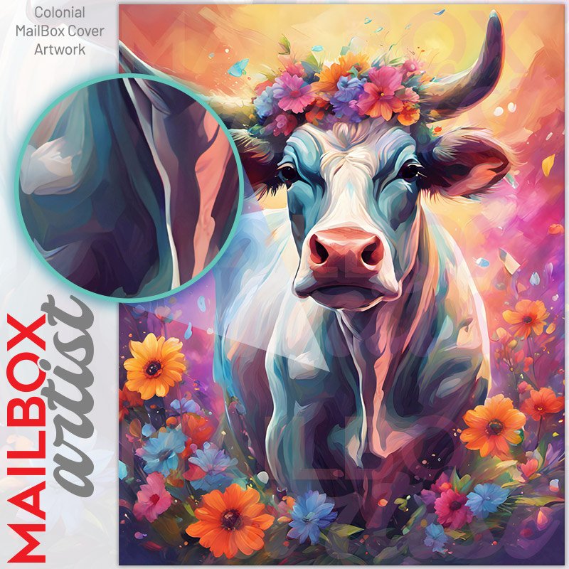 With this Farmhouse Cow with Flowers colonial mailbox cover it’s pretty easy to convert your mailbox to a special and unique item. These covers require a flat surface, so they work with colonial mailboxes that do not have any embossed decoration or signs. Magnetic mailbox covers work with steel colonial boxes only, while self-adhesive vinyl covers are available for aluminum, plastic and steel boxes. We also offer both self-adhesive and magnetic covers with regular opaque white vinyl or reflective vinyl, which works similarly to license plates or road signs. The reflective option makes the entire cover’s surface reflective, ensuring visibility at night. In case your mailbox doesn’t work with these covers, you can purchase the preinstalled cover on a brand new mailbox as well. Also, you can create your custom colonial mailbox cover using you own pictures, adding your name, street number, etc.
