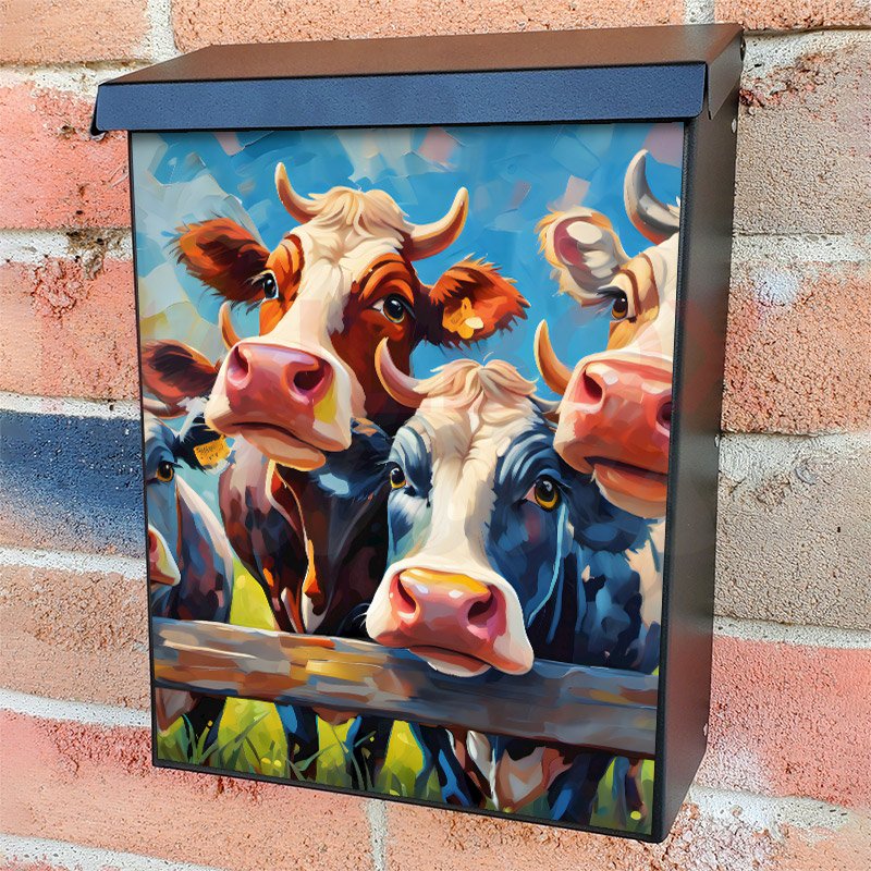 With this Farmhouse Cows Over the Fence colonial mailbox cover it’s pretty easy to convert your mailbox to a special and unique item. These covers require a flat surface, so they work with colonial mailboxes that do not have any embossed decoration or signs. Magnetic mailbox covers work with steel colonial boxes only, while self-adhesive vinyl covers are available for aluminum, plastic and steel boxes. We also offer both self-adhesive and magnetic covers with regular opaque white vinyl or reflective vinyl, which works similarly to license plates or road signs. The reflective option makes the entire cover’s surface reflective, ensuring visibility at night. In case your mailbox doesn’t work with these covers, you can purchase the preinstalled cover on a brand new mailbox as well. Also, you can create your custom colonial mailbox cover using you own pictures, adding your name, street number, etc.