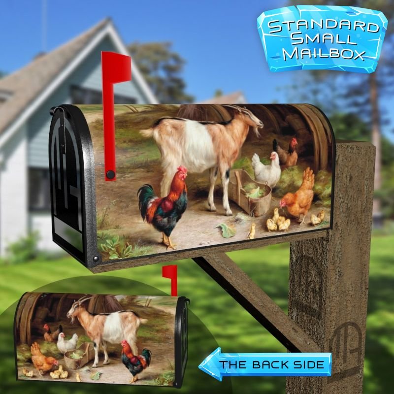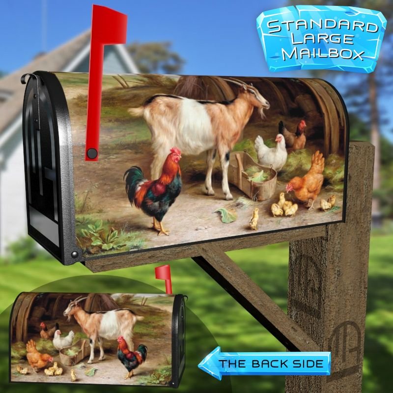 Dressing up your rural farm mailbox with the Feeding Time in the Farmyard #2 mailbox cover is an easy way to convert it into a unique and special item. These covers require a smooth surface, so they are compatible with rural farm mailboxes that do not have any embossed decorations or signs. Magnetic mailbox covers work with steel boxes only, while self-adhesive vinyl covers are available for aluminum, plastic and steel boxes. If your mailbox is not compatible with these covers, you can purchase a brand new mailbox with a preinstalled cover. Additionally, you have the option to create a custom rural farm mailbox cover with your own pictures, name, street number, etc.