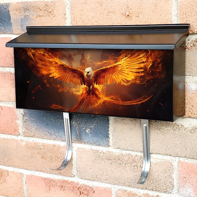Applying your Fire Phoenix Bird On Black townhouse / ranch mailbox cover it’s pretty easy to convert your mailbox to a special and unique item. These covers require a flat surface, so they work with townhouse / ranch mailboxes that do not have any embossed decoration or signs. Magnetic mailbox covers work with steel boxes, for aluminum and plastic boxes we offer the self-adhesive vinyl covers. In case your mailbox doesn’t work with these covers, you can purchase the preinstalled cover on a brand new mailbox as well. Also, you can create your custom townhouse / ranch mailbox cover using you own pictures, adding your name, street number, etc.