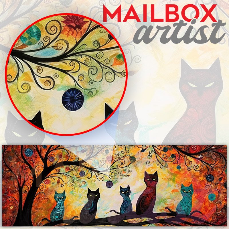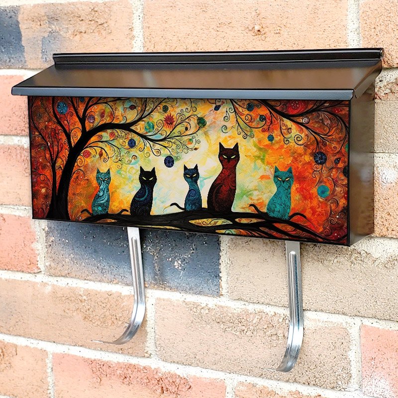 Applying your Five Happy Whimsical Cats townhouse / ranch mailbox cover it’s pretty easy to convert your mailbox to a special and unique item. These covers require a flat surface, so they work with townhouse / ranch mailboxes that do not have any embossed decoration or signs. Magnetic mailbox covers work with steel boxes, for aluminum and plastic boxes we offer the self-adhesive vinyl covers. In case your mailbox doesn’t work with these covers, you can purchase the preinstalled cover on a brand new mailbox as well. Also, you can create your custom townhouse / ranch mailbox cover using you own pictures, adding your name, street number, etc.