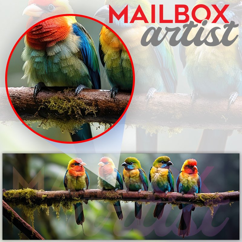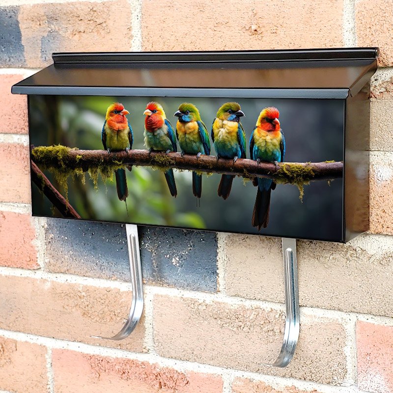 Applying your Five Tropical Birds Sitting On A Tree Branch townhouse / ranch mailbox cover it’s pretty easy to convert your mailbox to a special and unique item. These covers require a flat surface, so they work with townhouse / ranch mailboxes that do not have any embossed decoration or signs. Magnetic mailbox covers work with steel boxes, for aluminum and plastic boxes we offer the self-adhesive vinyl covers. In case your mailbox doesn’t work with these covers, you can purchase the preinstalled cover on a brand new mailbox as well. Also, you can create your custom townhouse / ranch mailbox cover using you own pictures, adding your name, street number, etc.