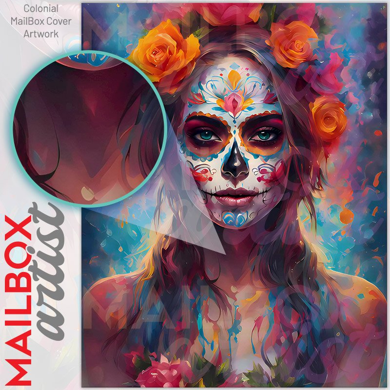 With this Flower Sugar Skull Woman colonial mailbox cover it’s pretty easy to convert your mailbox to a special and unique item. These covers require a flat surface, so they work with colonial mailboxes that do not have any embossed decoration or signs. Magnetic mailbox covers work with steel colonial boxes only, while self-adhesive vinyl covers are available for aluminum, plastic and steel boxes. We also offer both self-adhesive and magnetic covers with regular opaque white vinyl or reflective vinyl, which works similarly to license plates or road signs. The reflective option makes the entire cover’s surface reflective, ensuring visibility at night. In case your mailbox doesn’t work with these covers, you can purchase the preinstalled cover on a brand new mailbox as well. Also, you can create your custom colonial mailbox cover using you own pictures, adding your name, street number, etc.