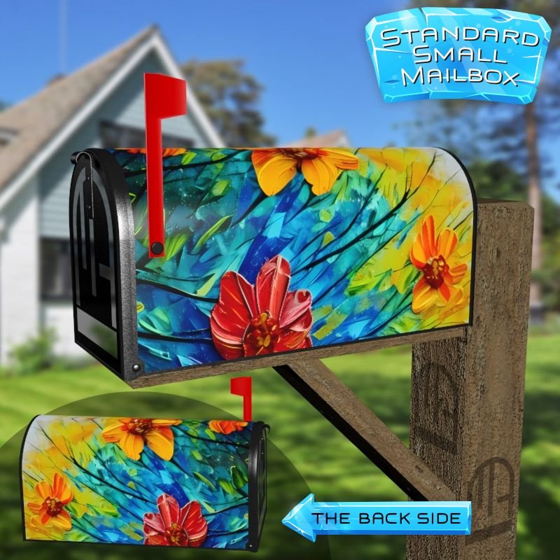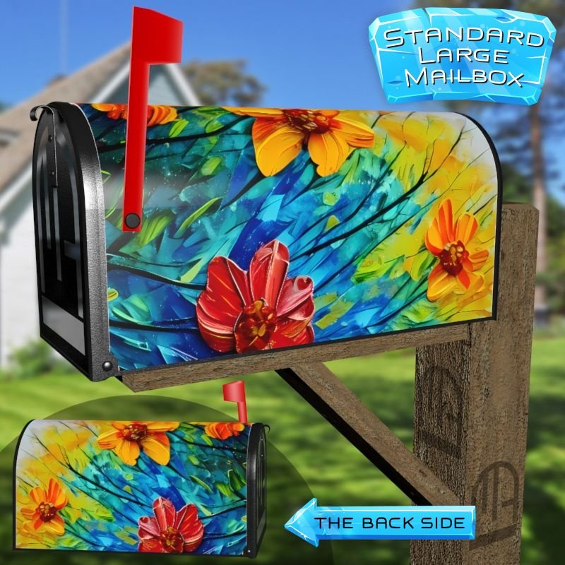 Dressing up your rural farm mailbox with the Flowers in the Sunset mailbox cover is an easy way to convert it into a unique and special item. These covers require a smooth surface, so they are compatible with rural farm mailboxes that do not have any embossed decorations or signs. Magnetic mailbox covers work with steel boxes only, while self-adhesive vinyl covers are available for aluminum, plastic and steel boxes. If your mailbox is not compatible with these covers, you can purchase a brand new mailbox with a preinstalled cover. Additionally, you have the option to create a custom rural farm mailbox cover with your own pictures, name, street number, etc.