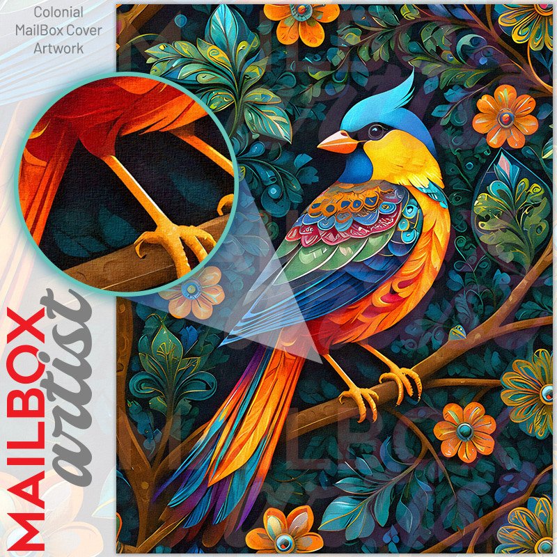 With this Folklore Bird on a Blooming Tree colonial mailbox cover it’s pretty easy to convert your mailbox to a special and unique item. These covers require a flat surface, so they work with colonial mailboxes that do not have any embossed decoration or signs. Magnetic mailbox covers work with steel colonial boxes only, while self-adhesive vinyl covers are available for aluminum, plastic and steel boxes. We also offer both self-adhesive and magnetic covers with regular opaque white vinyl or reflective vinyl, which works similarly to license plates or road signs. The reflective option makes the entire cover’s surface reflective, ensuring visibility at night. In case your mailbox doesn’t work with these covers, you can purchase the preinstalled cover on a brand new mailbox as well. Also, you can create your custom colonial mailbox cover using you own pictures, adding your name, street number, etc.