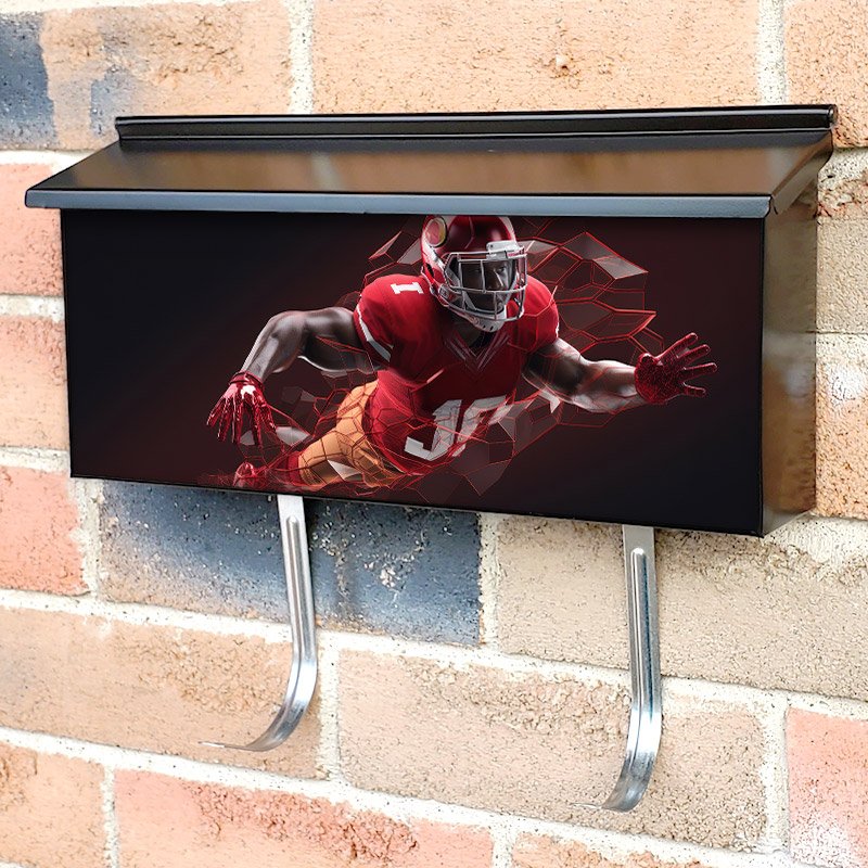 Applying your Football Player townhouse / ranch mailbox cover it’s pretty easy to convert your mailbox to a special and unique item. These covers require a flat surface, so they work with townhouse / ranch mailboxes that do not have any embossed decoration or signs. Magnetic mailbox covers work with steel boxes, for aluminum and plastic boxes we offer the self-adhesive vinyl covers. In case your mailbox doesn’t work with these covers, you can purchase the preinstalled cover on a brand new mailbox as well. Also, you can create your custom townhouse / ranch mailbox cover using you own pictures, adding your name, street number, etc.