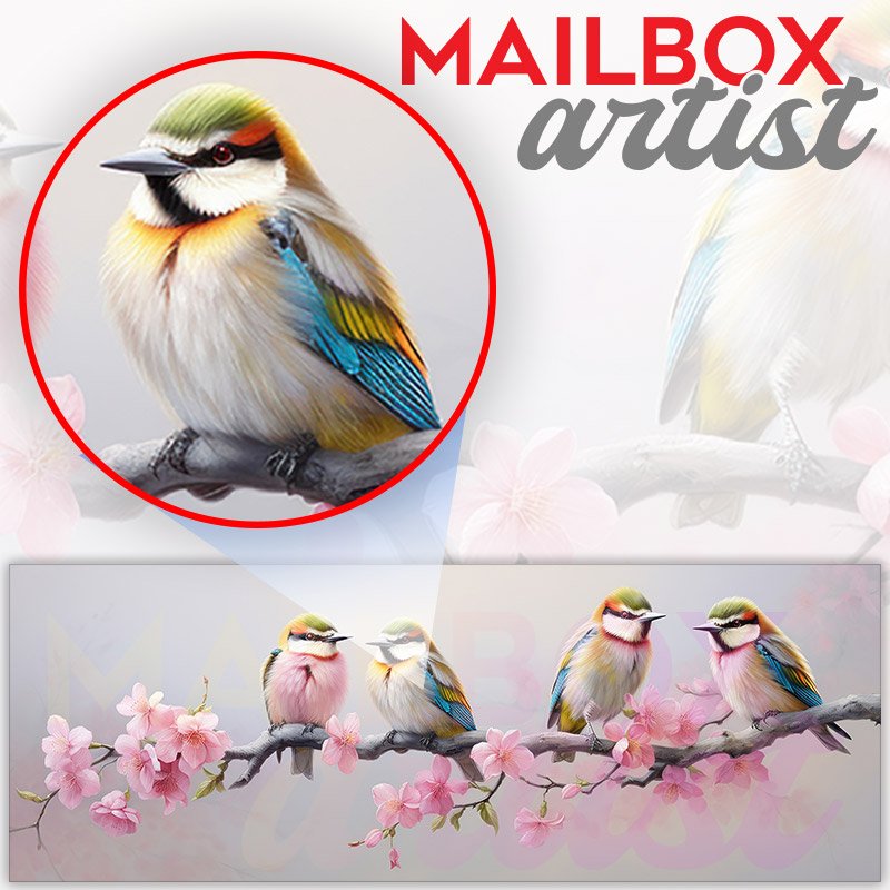 Applying your Four Colorful Birds Sitting On A Branch 3 townhouse / ranch mailbox cover it’s pretty easy to convert your mailbox to a special and unique item. These covers require a flat surface, so they work with townhouse / ranch mailboxes that do not have any embossed decoration or signs. Magnetic mailbox covers work with steel boxes, for aluminum and plastic boxes we offer the self-adhesive vinyl covers. In case your mailbox doesn’t work with these covers, you can purchase the preinstalled cover on a brand new mailbox as well. Also, you can create your custom townhouse / ranch mailbox cover using you own pictures, adding your name, street number, etc.