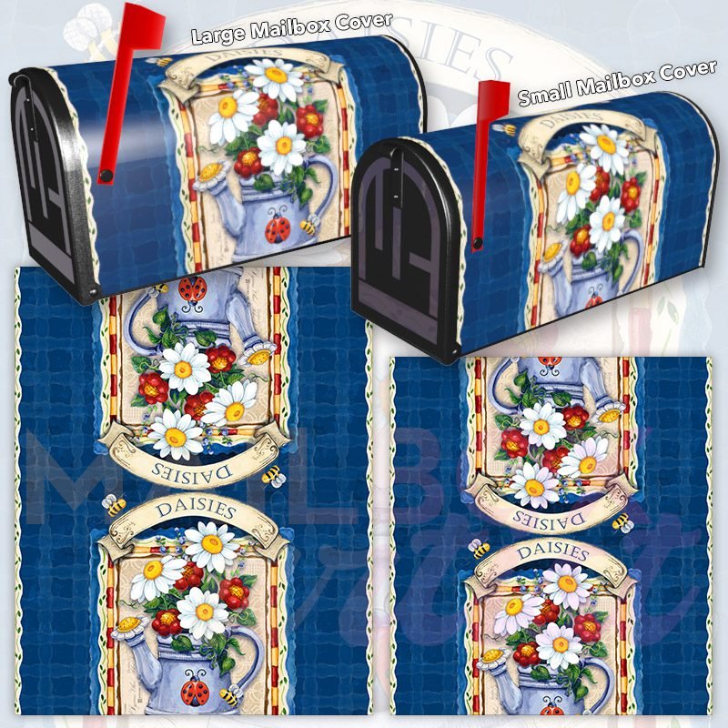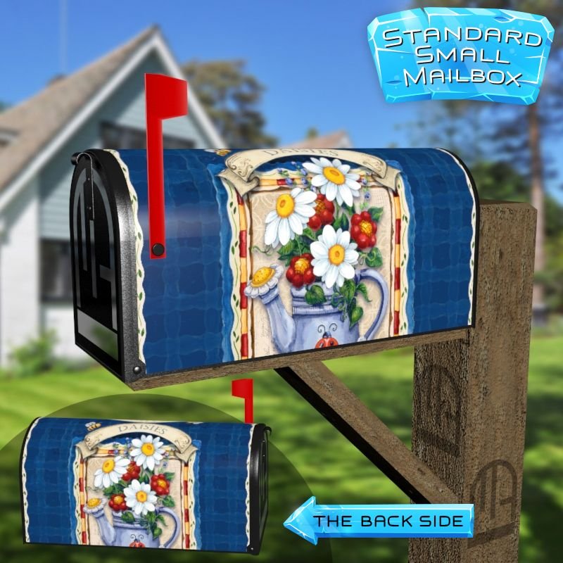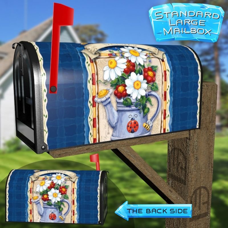 Dressing up your rural farm mailbox with the Frontier Woman Watering Can with Daisies mailbox cover is an easy way to convert it into a unique and special item. These covers require a smooth surface, so they are compatible with rural farm mailboxes that do not have any embossed decorations or signs. Magnetic mailbox covers work with steel boxes only, while self-adhesive vinyl covers are available for aluminum, plastic and steel boxes. If your mailbox is not compatible with these covers, you can purchase a brand new mailbox with a preinstalled cover. Additionally, you have the option to create a custom rural farm mailbox cover with your own pictures, name, street number, etc.
