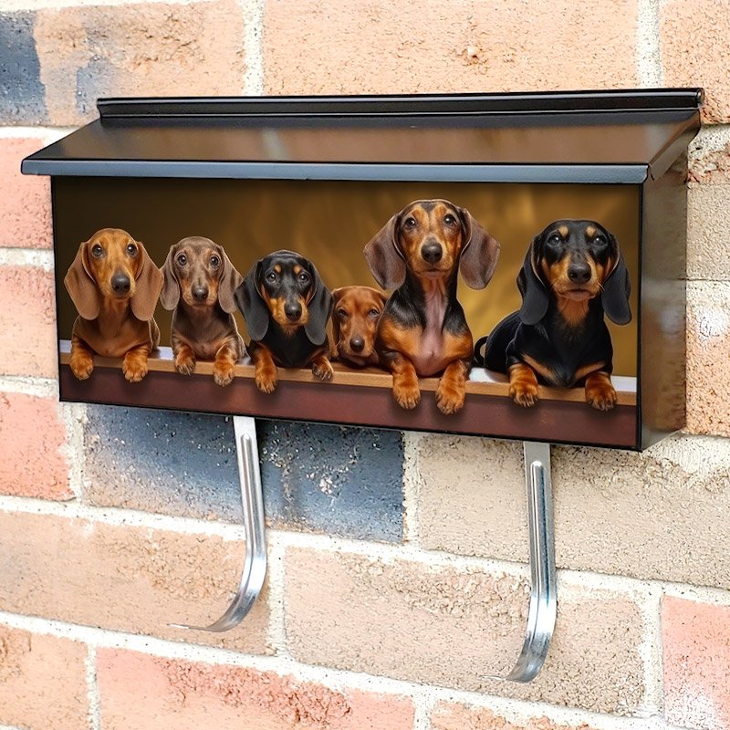 Applying your Funny Dachshunds Sitting On Fence townhouse / ranch mailbox cover it’s pretty easy to convert your mailbox to a special and unique item. These covers require a flat surface, so they work with townhouse / ranch mailboxes that do not have any embossed decoration or signs. Magnetic mailbox covers work with steel boxes, for aluminum and plastic boxes we offer the self-adhesive vinyl covers. In case your mailbox doesn’t work with these covers, you can purchase the preinstalled cover on a brand new mailbox as well. Also, you can create your custom townhouse / ranch mailbox cover using you own pictures, adding your name, street number, etc.
