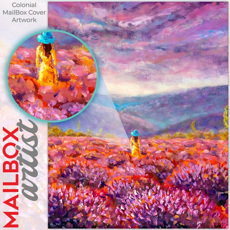With this Girl in the Lavender Field colonial mailbox cover it’s pretty easy to convert your mailbox to a special and unique item. These covers require a flat surface, so they work with colonial mailboxes that do not have any embossed decoration or signs. Magnetic mailbox covers work with steel colonial boxes only, while self-adhesive vinyl covers are available for aluminum, plastic and steel boxes. We also offer both self-adhesive and magnetic covers with regular opaque white vinyl or reflective vinyl, which works similarly to license plates or road signs. The reflective option makes the entire cover’s surface reflective, ensuring visibility at night. In case your mailbox doesn’t work with these covers, you can purchase the preinstalled cover on a brand new mailbox as well. Also, you can create your custom colonial mailbox cover using you own pictures, adding your name, street number, etc.